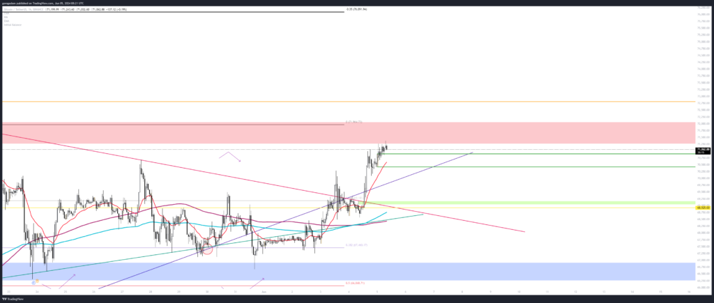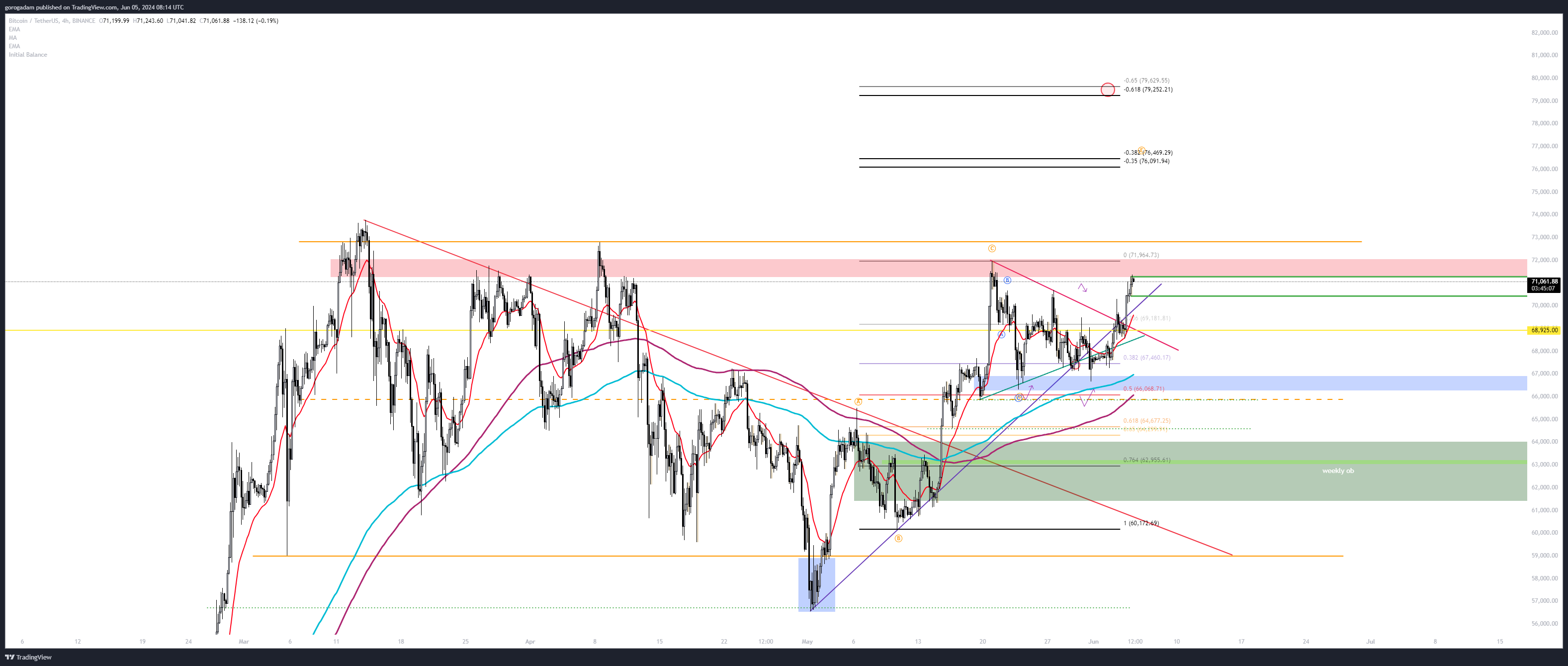 Szerintem visszatér a „buy high, sell higher” piac, mivel a lila vonalat már nem kellene elveszítenie a BTC-nek (tekintve, hogy most szerezte vissza), de akkor már jobb ötlet a zóna kitörését longolni.