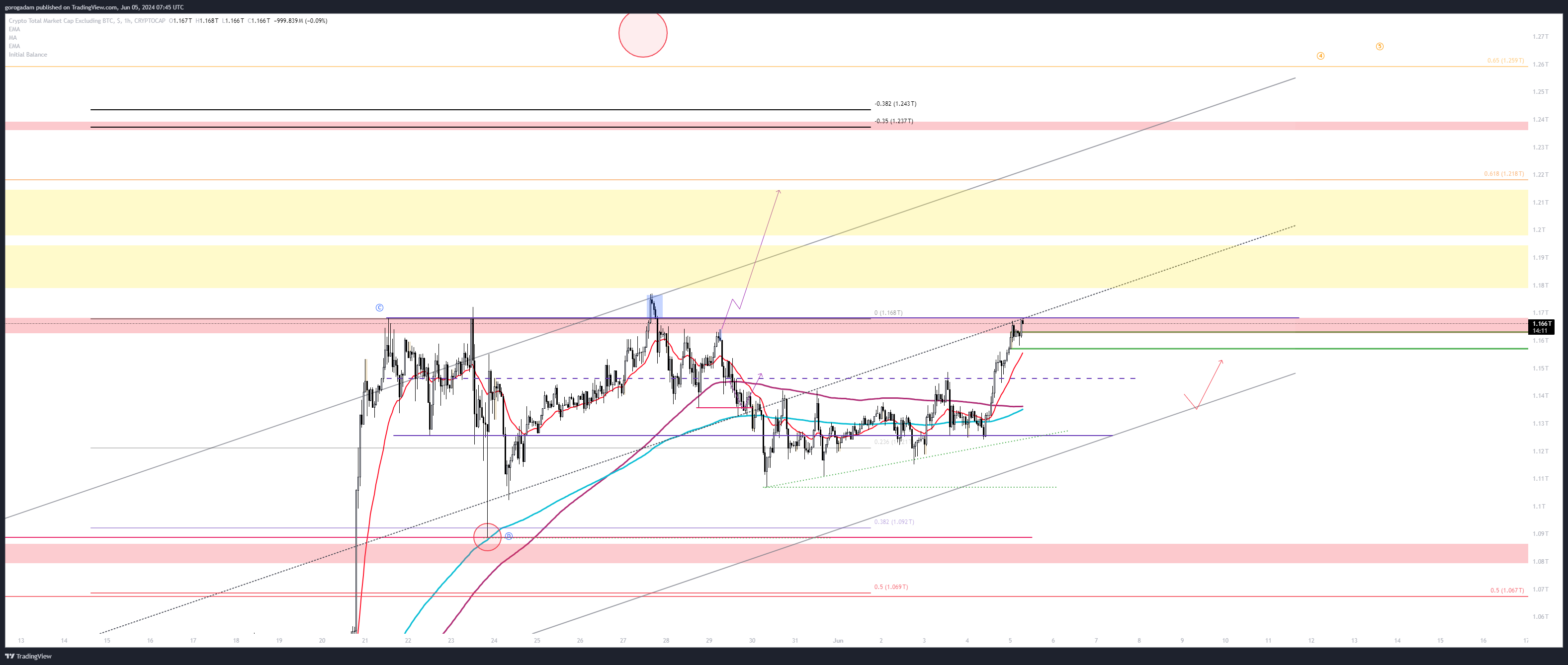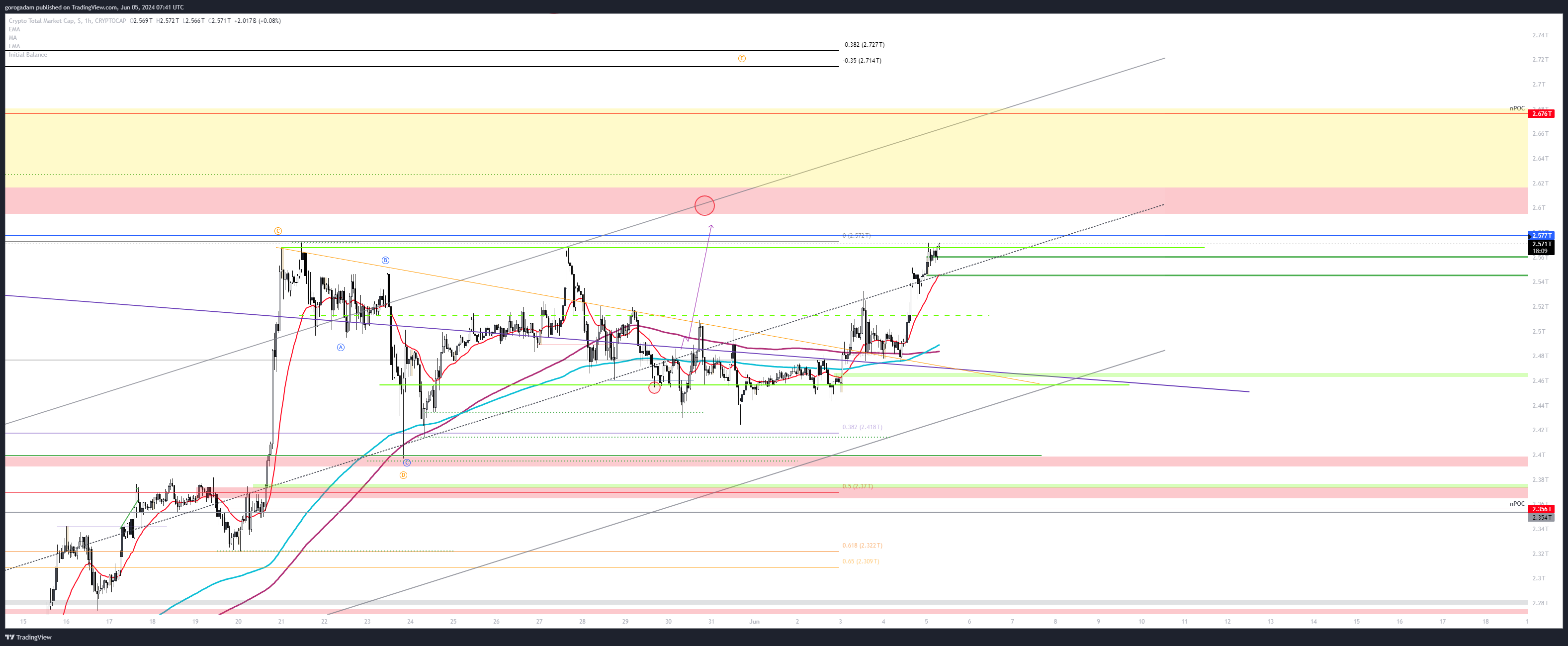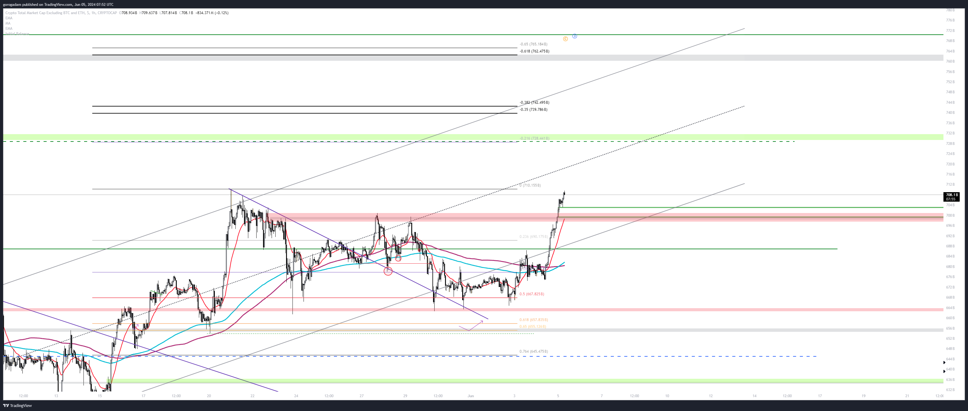 TOTAL3 legutóbbi kereskedési trigger: visszatértünk a sötétzölddel jelölt zónába, így egyértelműen a tetejét, 770B-t célozzuk, csak annyi a dolgunk, hogy ne b@sszuk el közben, és ez egy szép 10%-os mozgás csak addig, követve a csatornát.
