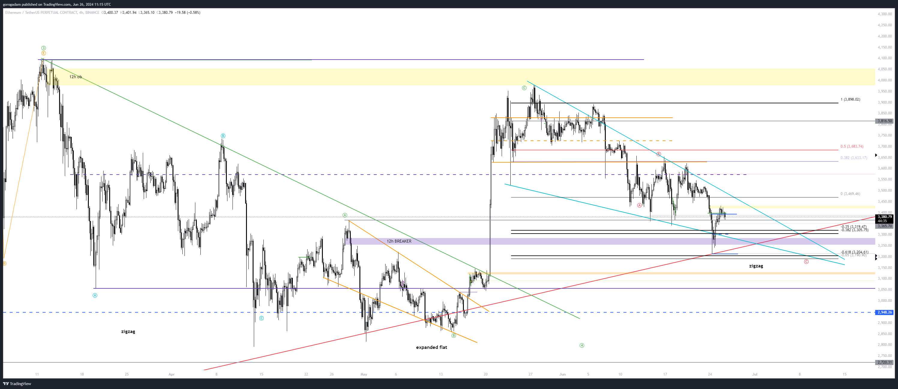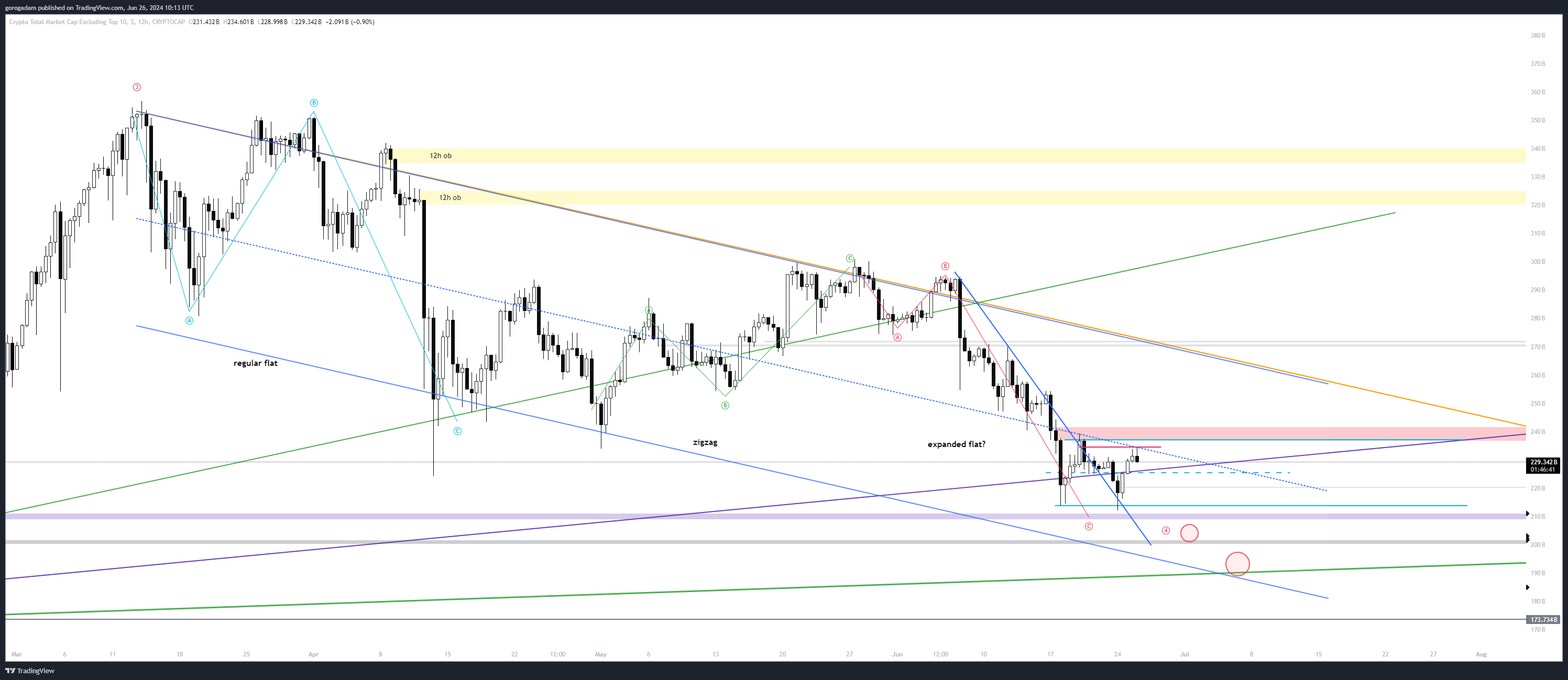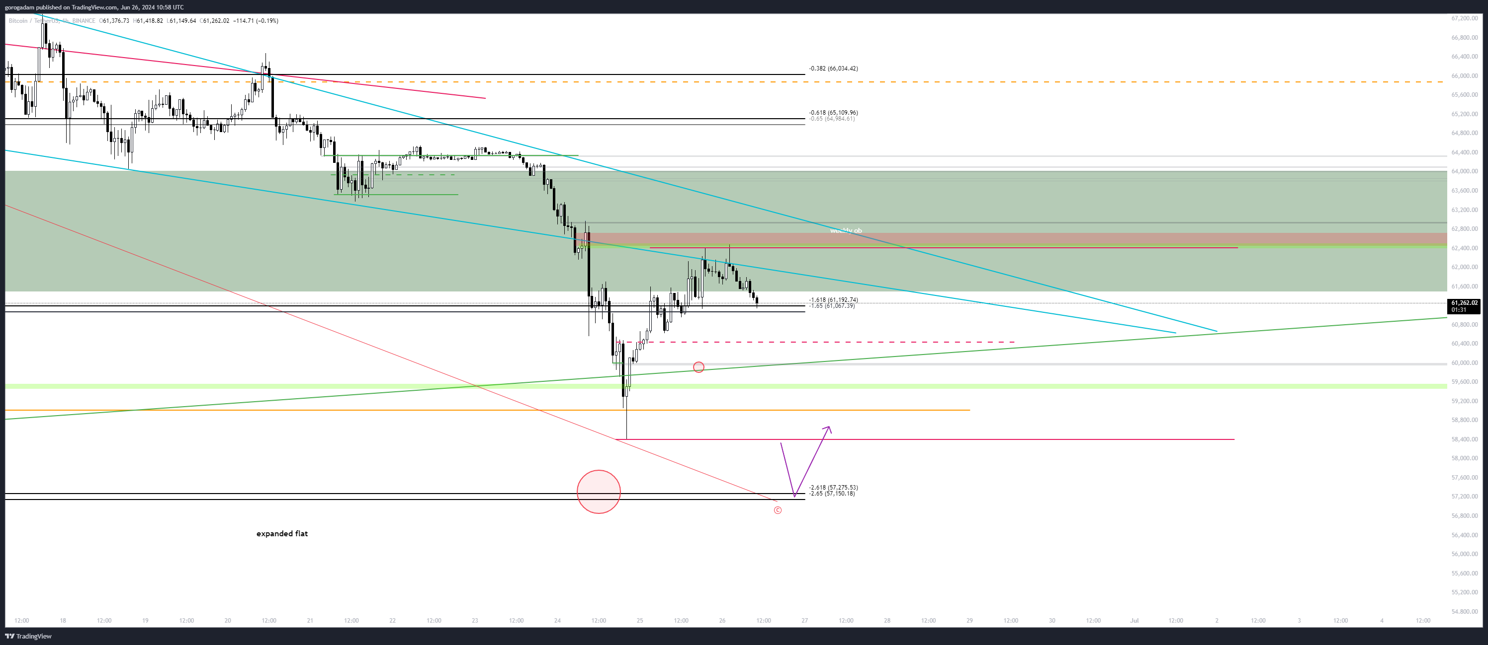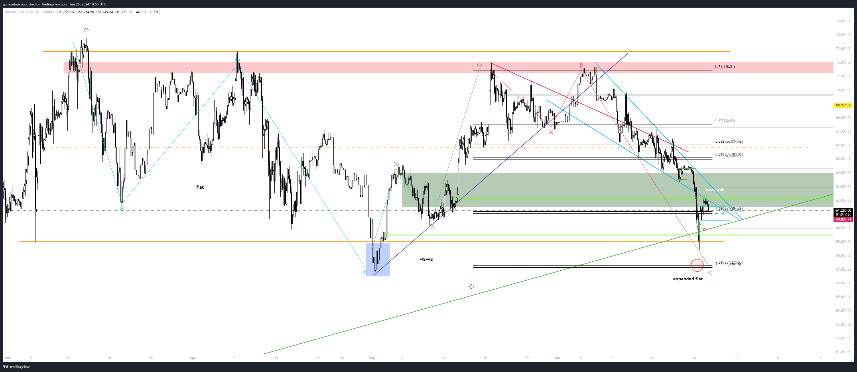 Szerintem a BTC-n egy elég ritka, és összetett jelenséget látunk, az expanded flat-et,de lehet egyszerűen csak a képen alakuló piros zóna alapján kereskedni (zóna aljának deviálására számítok, ha visszaszerzi az long trigger).