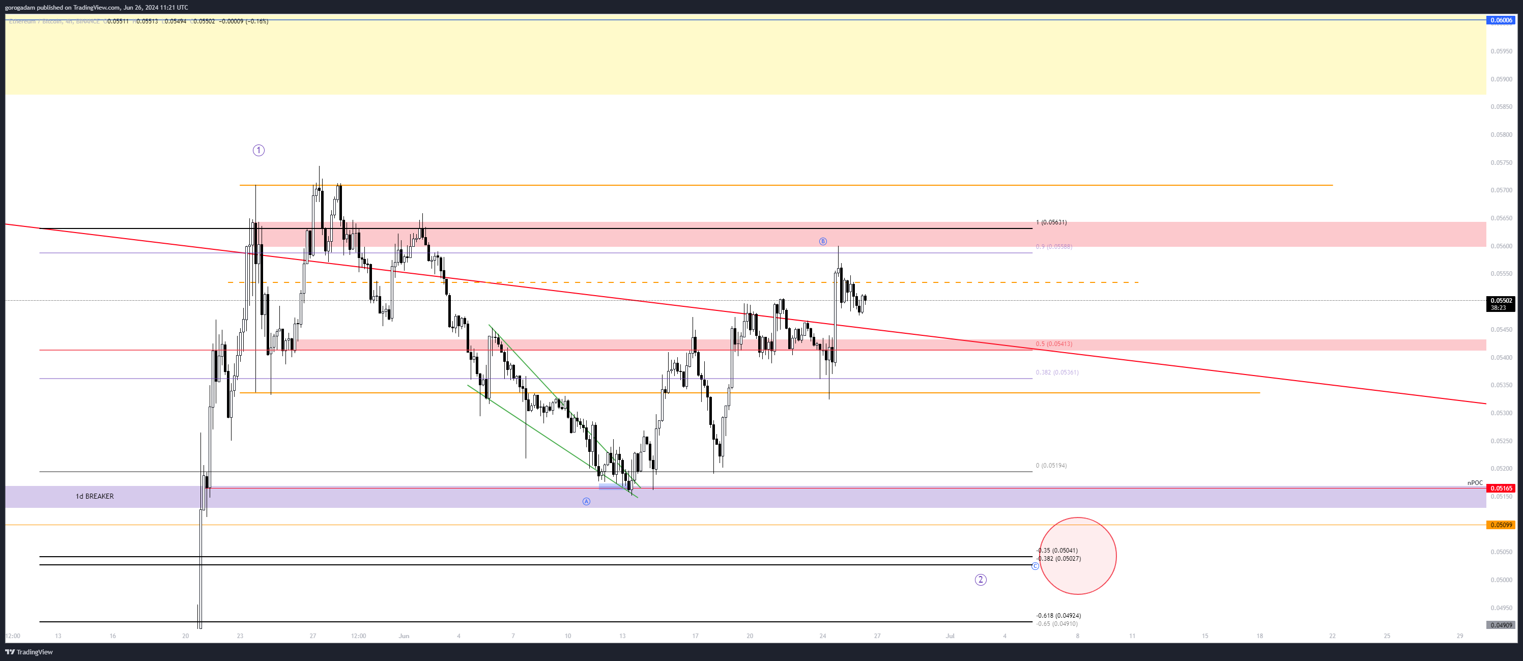 Az ETHBTC elérte azt a szintet (0.9 FIB = 90% visszahúzás), ami egy flat korrekciós hullám során szokott történni, és elutasítódott onnan – nekem ez egyelőre ismét egy bizonyíték, hogy az ETH rövid távon alul fog teljesíteni még.