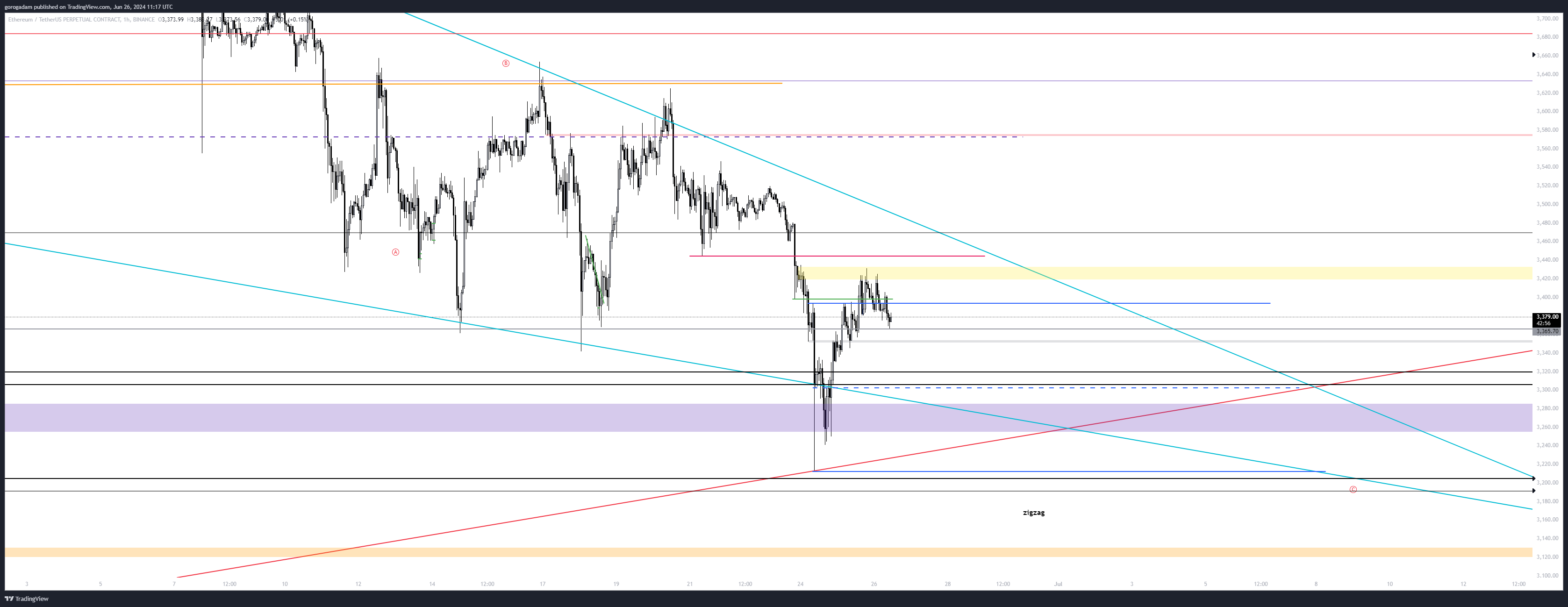 Szerintem 3444 egy jó short lehetőség is lehet akár (korábbi 4 órás aljpont), majd utána visszaesés a zónába és irány a másik oldal deviálása.
