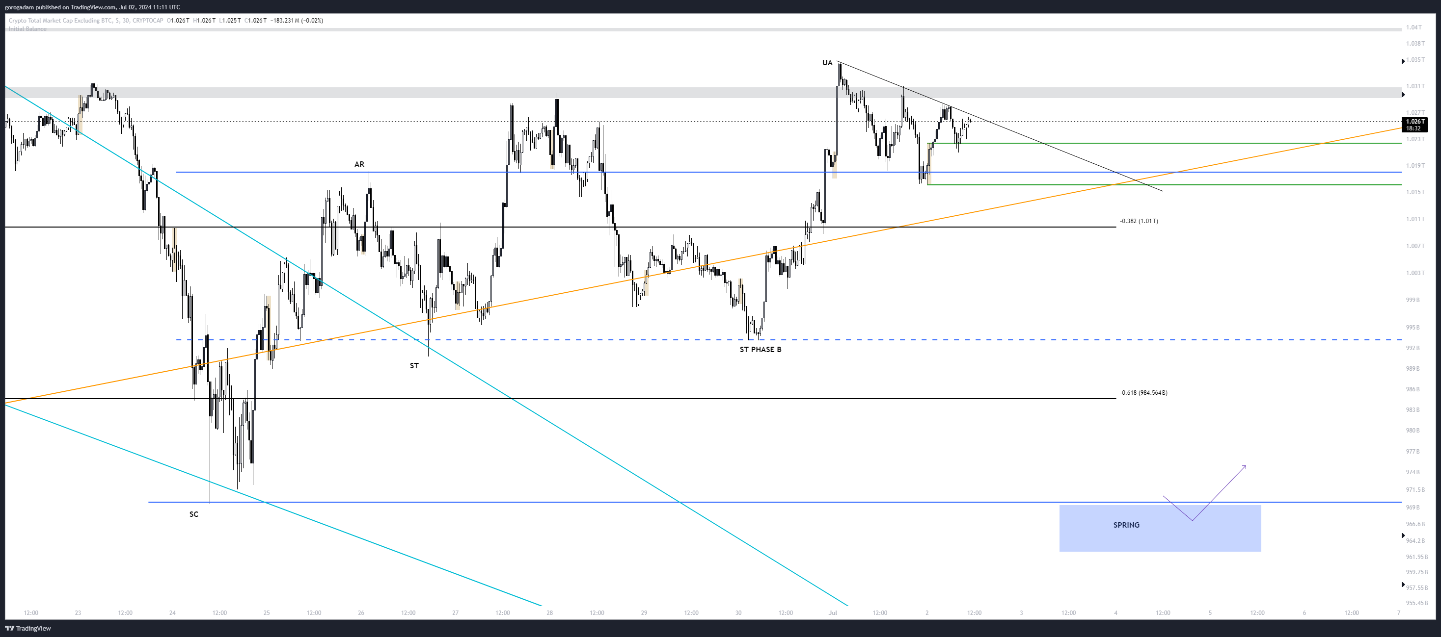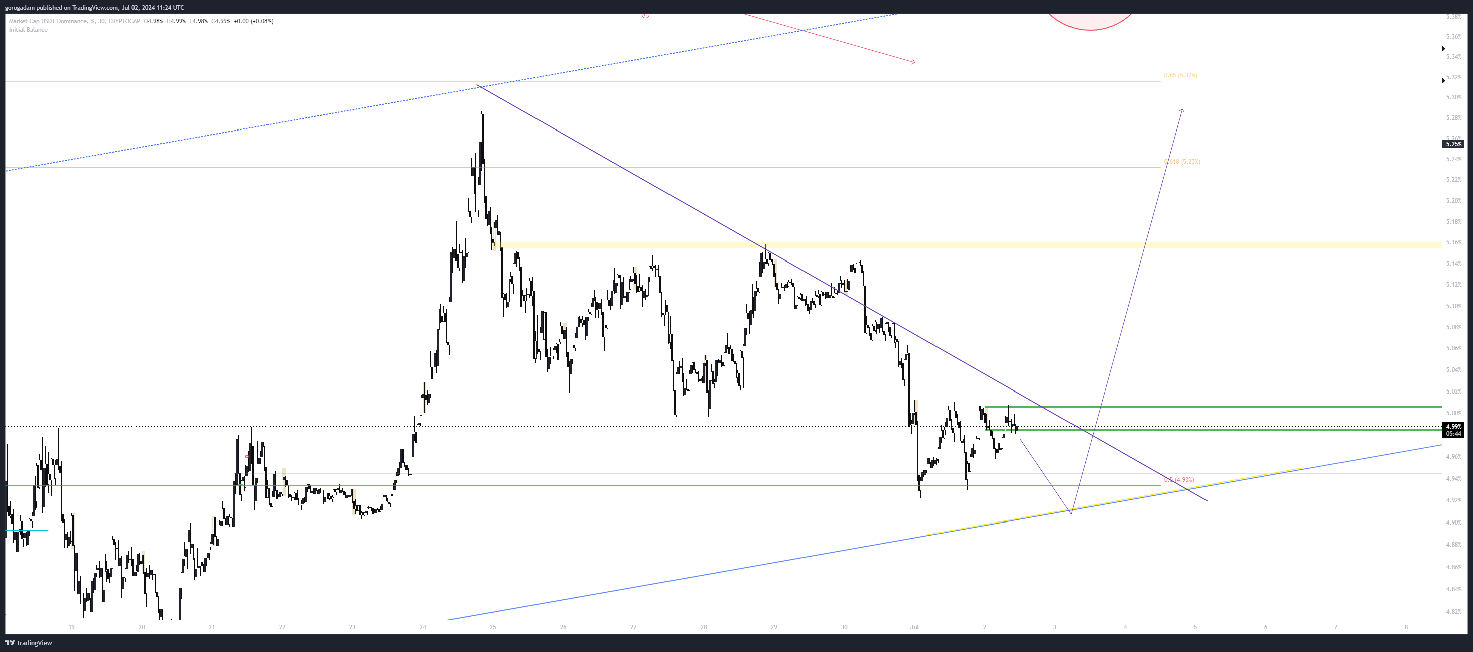 USDT.d legutóbbi kereskedési trigger: közeledünk a csatorna aljához (kék vonal a képen), ami fontos támaszként szolgál – vagy letörik, vagy nagyot pattan róla az árfolyam.