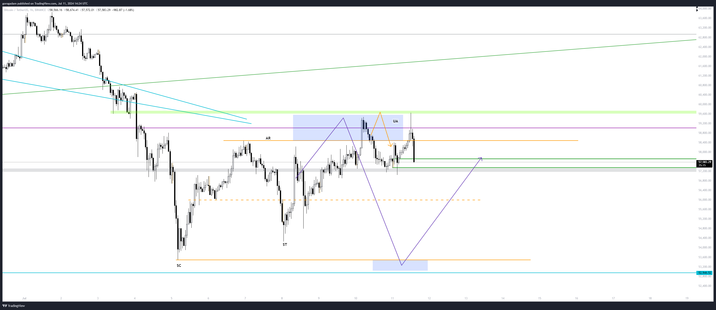 EZen a grafikonon a legegyértelműbb az elutasítódás, és pontosan a narancs nyíl szerint alakult – tesztelve a korábbi leszakadás kiindulópontját, és azonnal lefordult onnan, vissza a Wyckoff zónába.