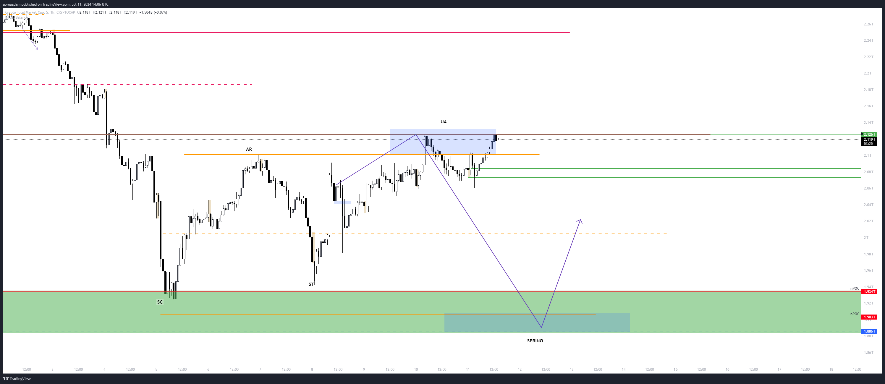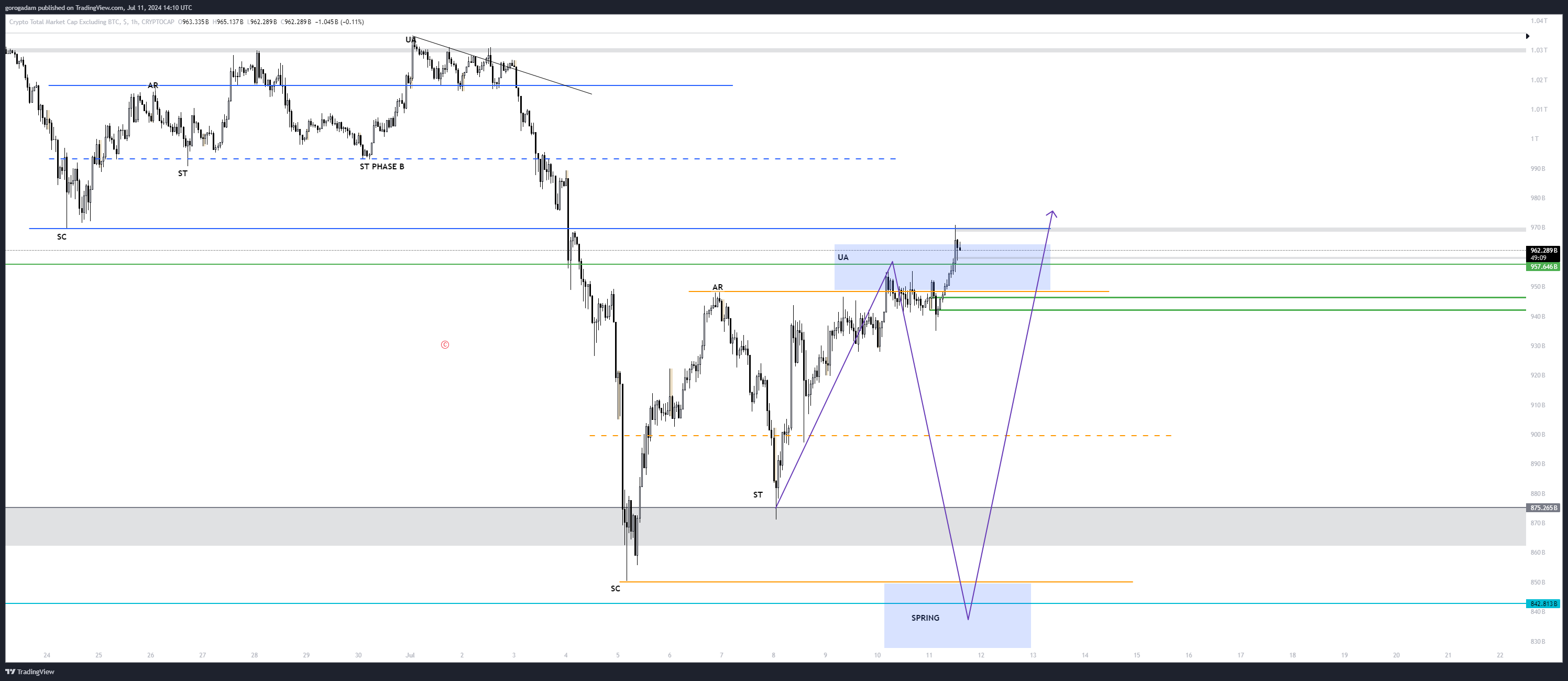 TOTAL2 legutóbbi kereskedési trigger: a TOTAL2 egyelőre úgy néz ki, hogy medvésen tesztelte a korábbi Wyckoff akkumuláció aljpontját, ami könnyen lehet egy olyan hely, ahol a korábbi vásárlók/longok shortba mennek.