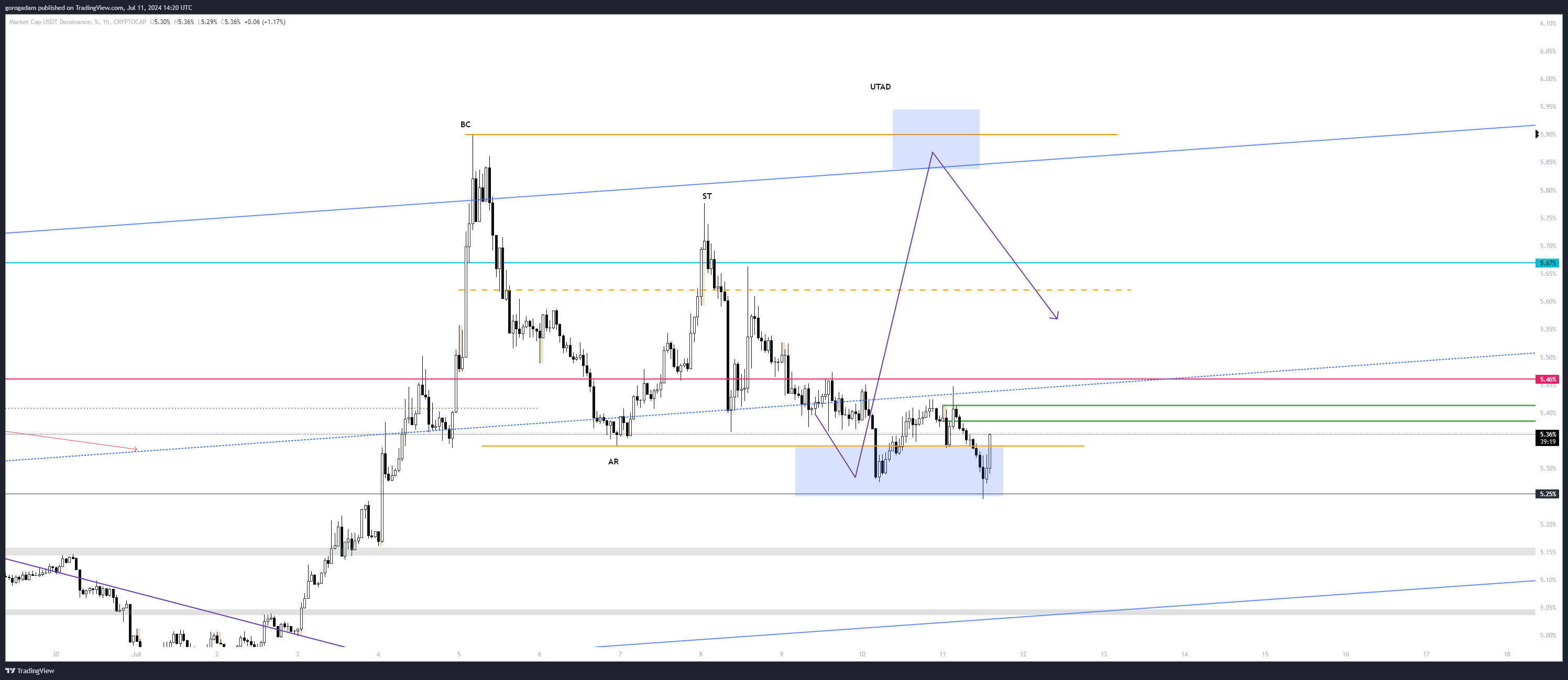 USDT.d legutóbbi kereskedési trigger: az USDT.d még mindig azon belül van, hogy ez egy deviálás a zóna alján, igazából csak kisöpörte a korábbi aljpontot és pattant, és egyelőre épp visszaszerzi a zóna alját, igazolva a deviálást.