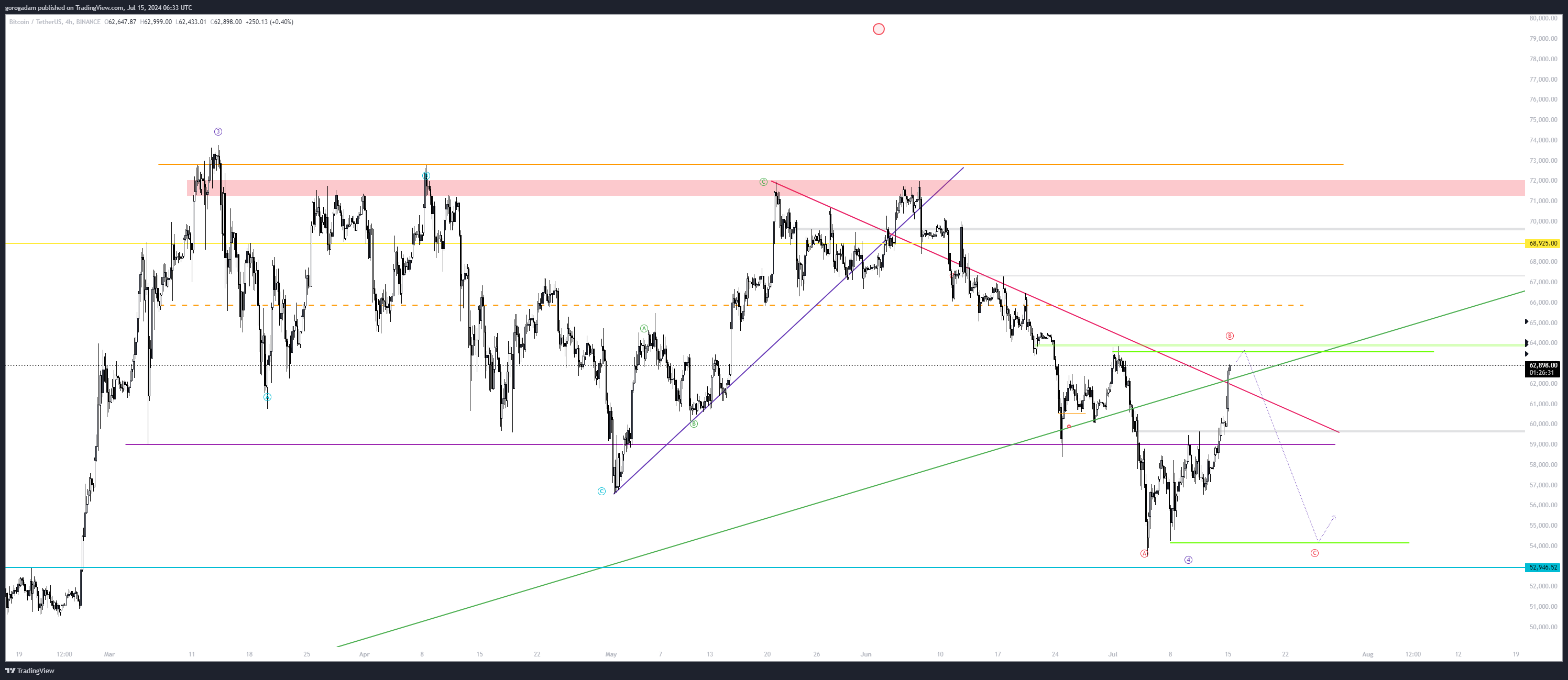 Egy ideje gondot jelentett nekem, hogy nem tudom értelmezni az utolsó 3 hullámot, most sikerült találni egy lehetséges helyet (piros ABC) – a limezöld vonal 63 500-nál korábbi esés 0,5-ös FIBhez történő visszahúzása lenne (a napzárásokat tekintve a mozgás aljának/tetejének), ha innen elutasítódna, az lenne egy korai jele, hogy ez a terv lesz érvényes.
