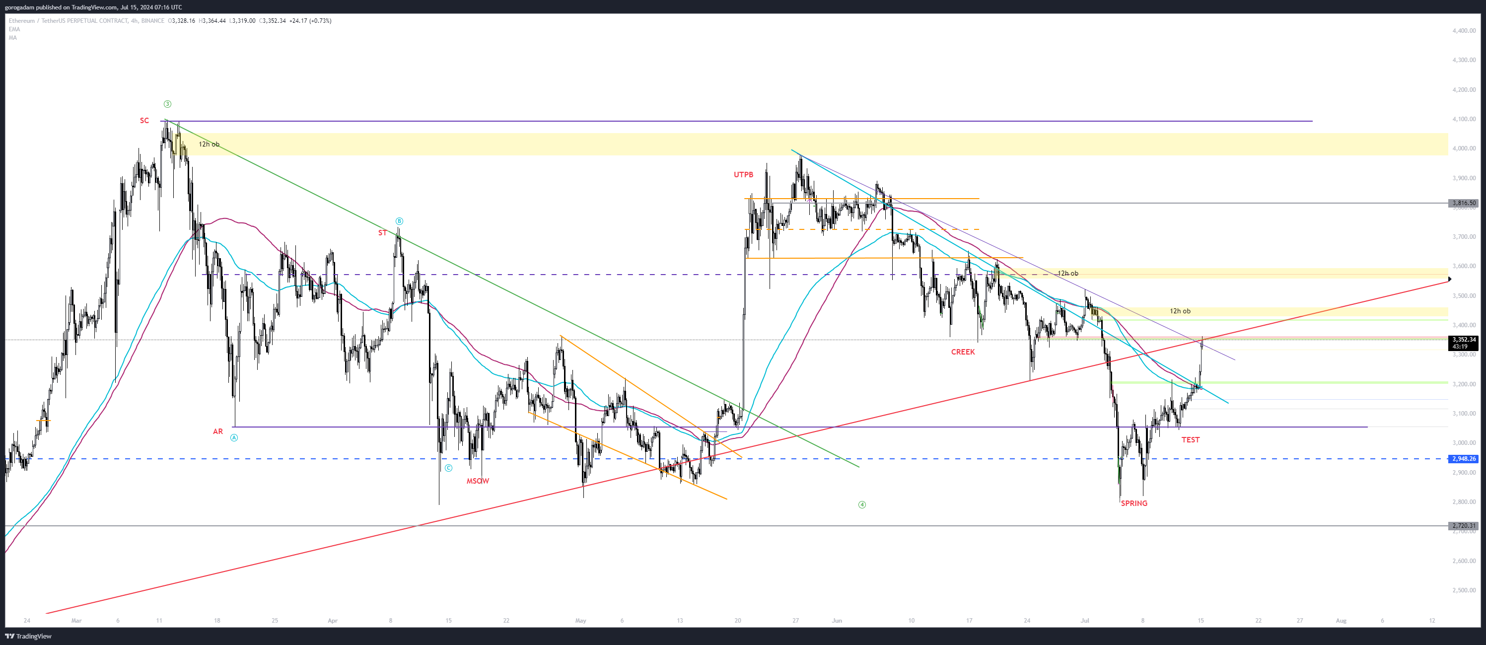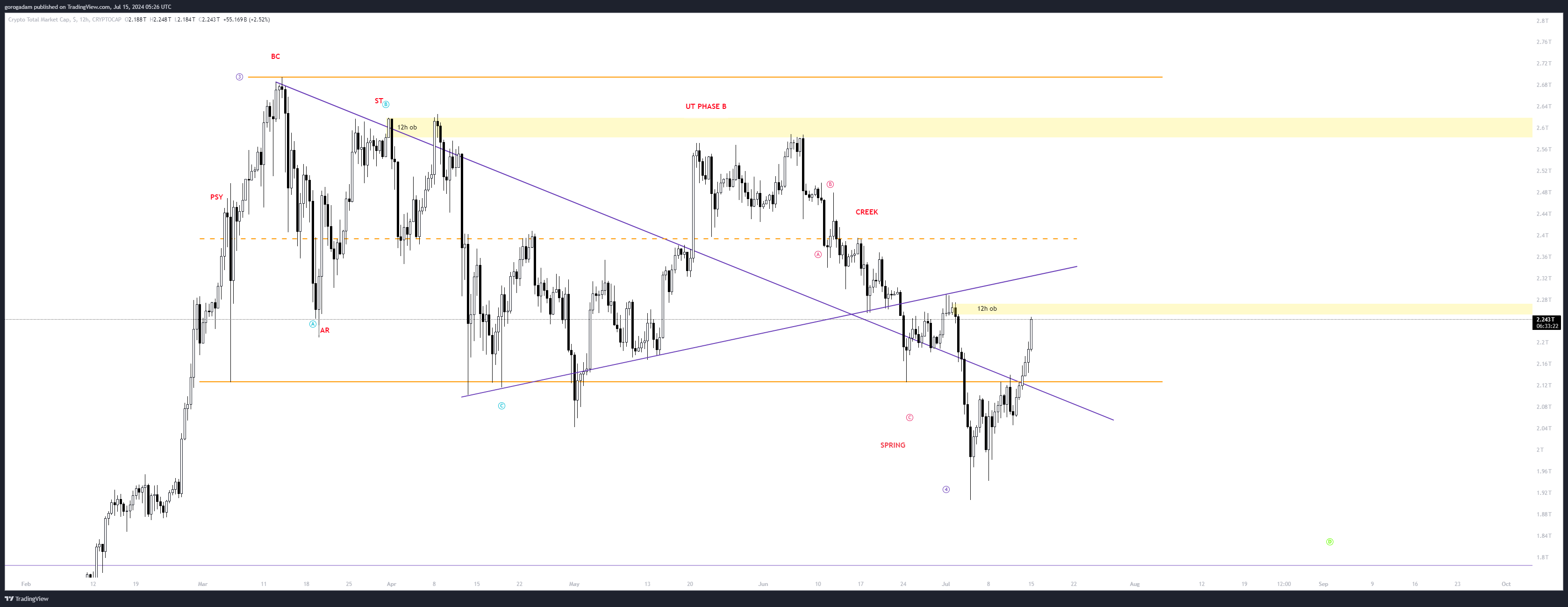 Egy másik érdekes szint természetesen a jelölt 12 órás OB + leszakadás kiindulópontja + a Wyckoff AR szint, ahonnan egy shortot lehet tervezni, de a jelenlegi körülmények között csak akkor, ha ellenállássá alakul korábbi támasz, bizonyítva, hogy a medvék visszavették az irányítást.