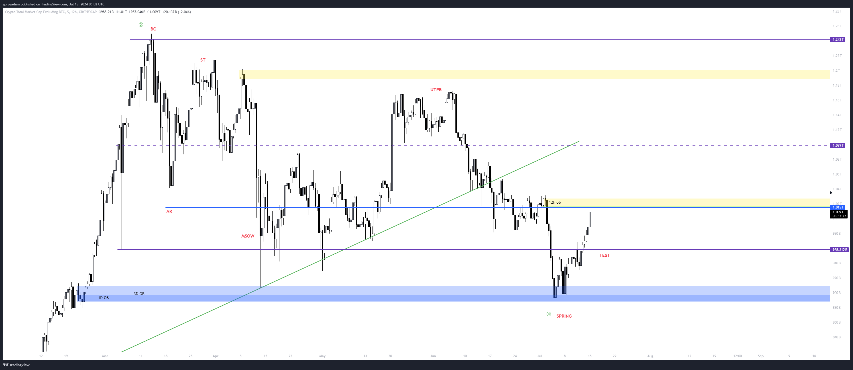TOTAL2 legutóbbi kereskedési trigger: a TOTAL2-n is azt látom egyelőre, hogy el kell fogadni, hogy ilyen balfékül alakult alacsony időtávon a dolog, és figyelni a HTF visszatesztet, ami ezek alapján a 958.312B-s zónaaljnál kellene, hogy legyen.