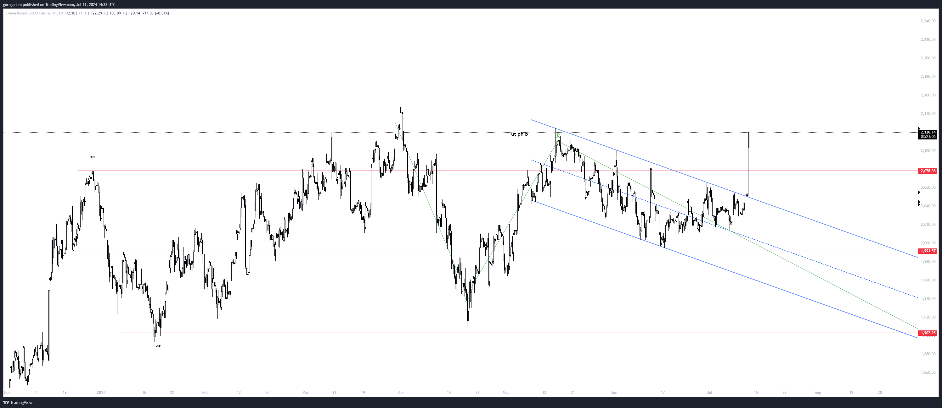 Továbbra is főleg a US2000-et figyelem: ha az NQ és az ES korrekióba kezd, akkor biztos vagyok benne, hogy ez sem fogja megúszni, és egy nagyon alacsony piaci hatékonyságú kitörés után könnyen lehet, hogy akár az egészet visszahúzza.