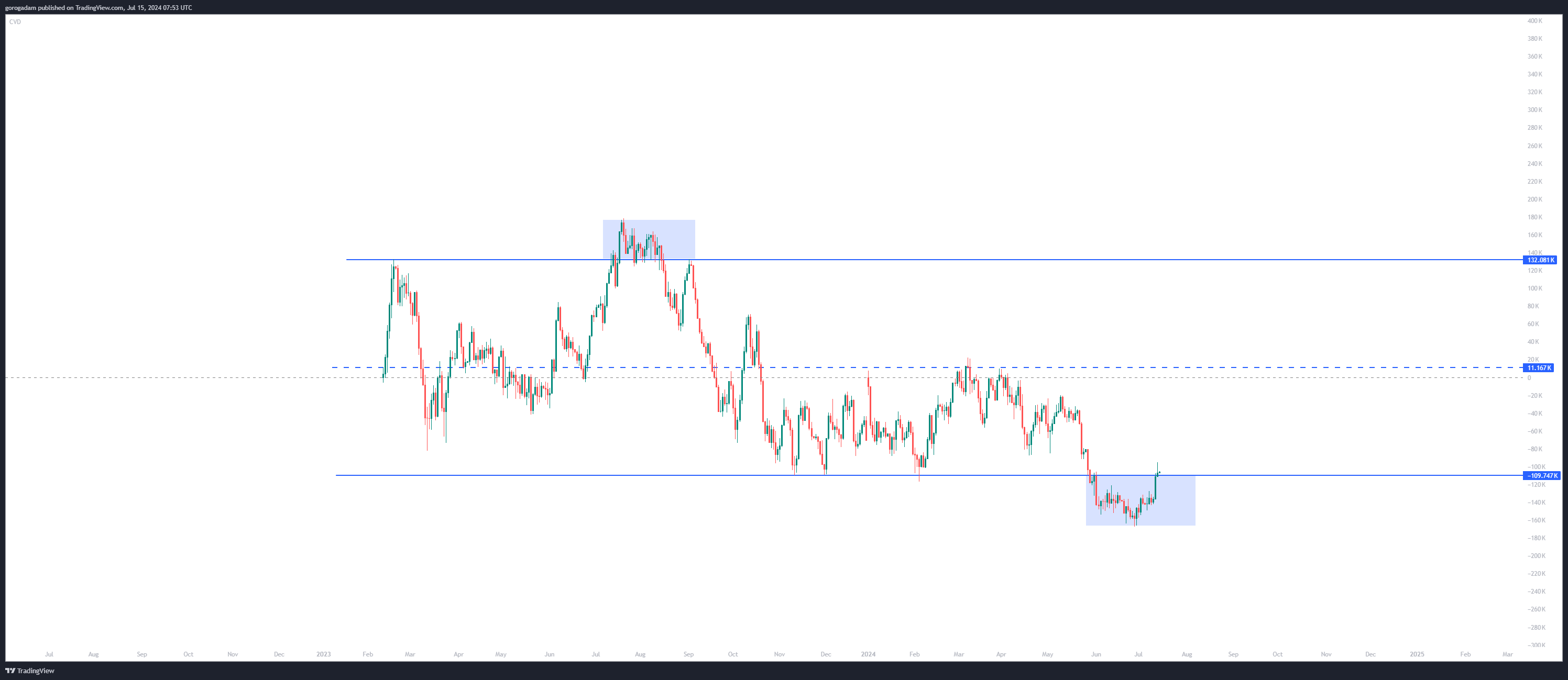 Ugye hosszabb távon egy reakkumulációt vártam (lenti képen), ami szépen meg is történt, de alacsony időtávon elég szokatlanul.