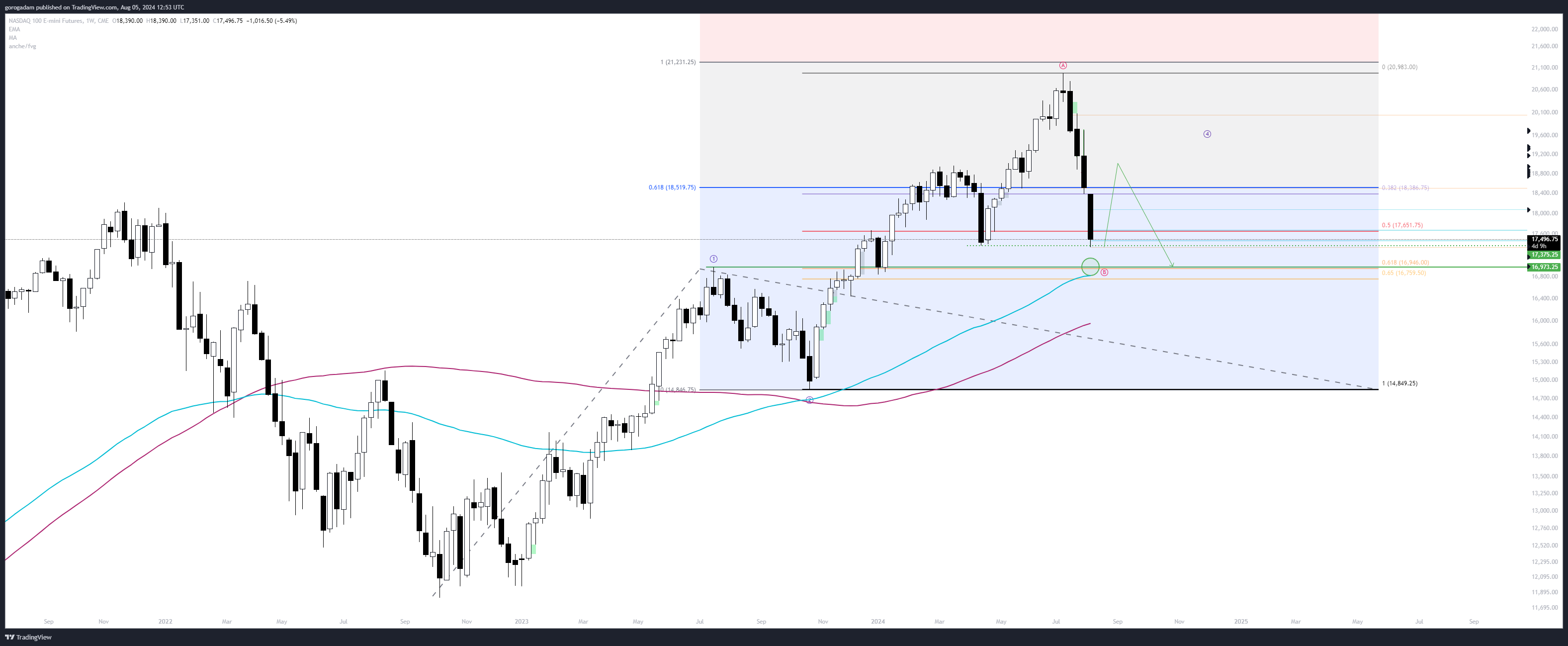 NASDAQ elemzés – HTF helyzet: a NASDAQ-en nekem úgy néz ki, hogy vissza fogjuk tesztelni az első hullám tetejét, de mivel a korrekciónak mindenképp ABC alakzatban kell történnie, és most ütöttünk ki egy hetes likviditást (ami szerintem nem véletlen kerül oda), ezért pattannia fogunk, és a zöld nyíl szerint kb a 100 napos EMA-ig mehetünk fel.