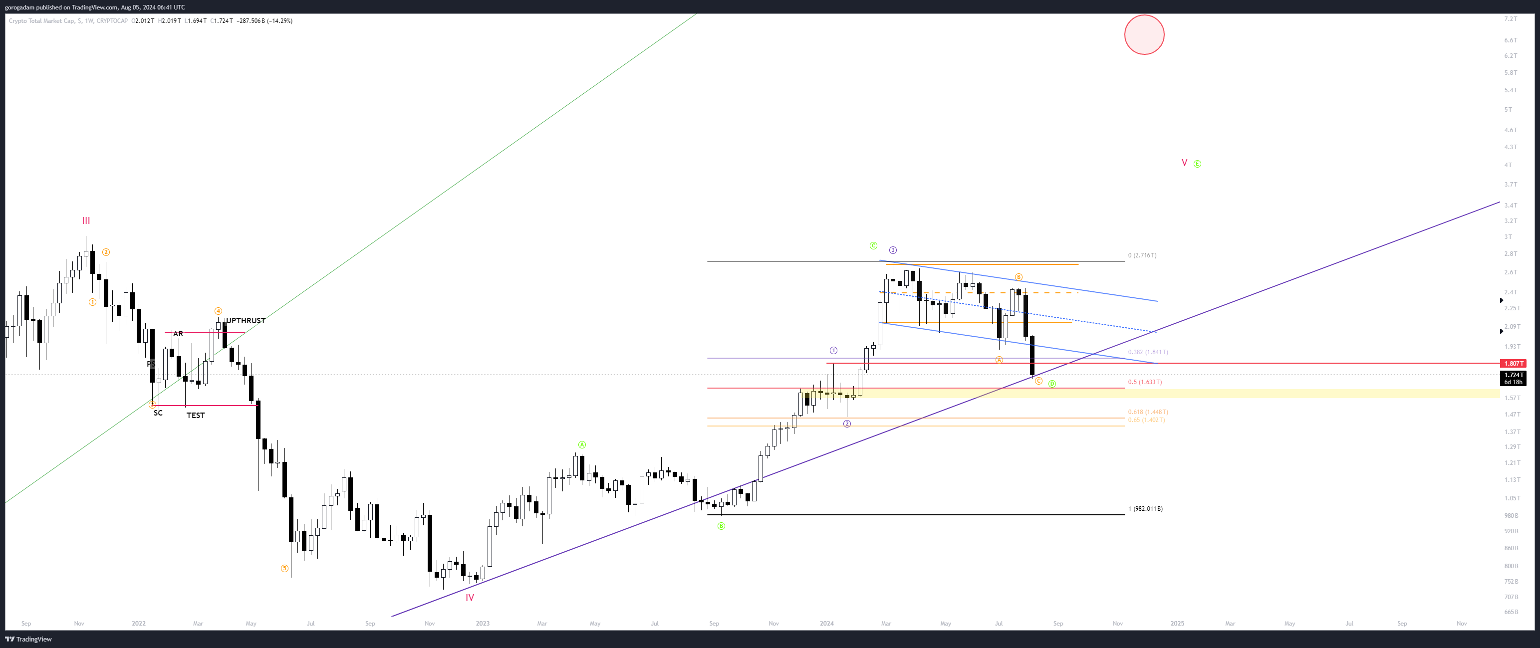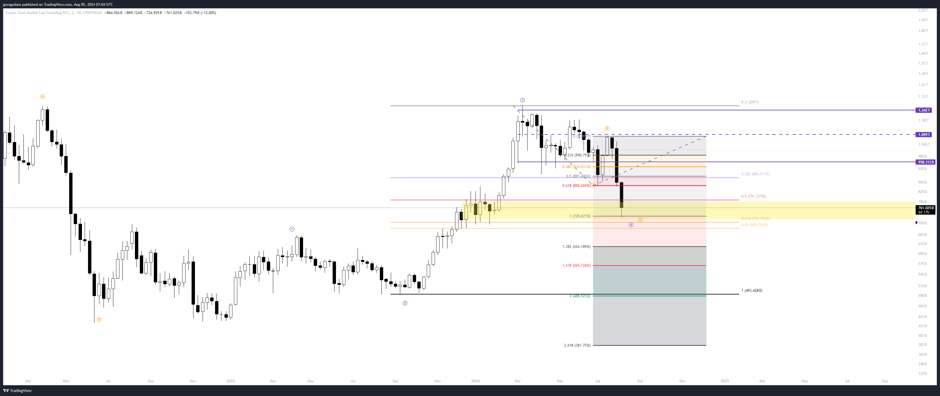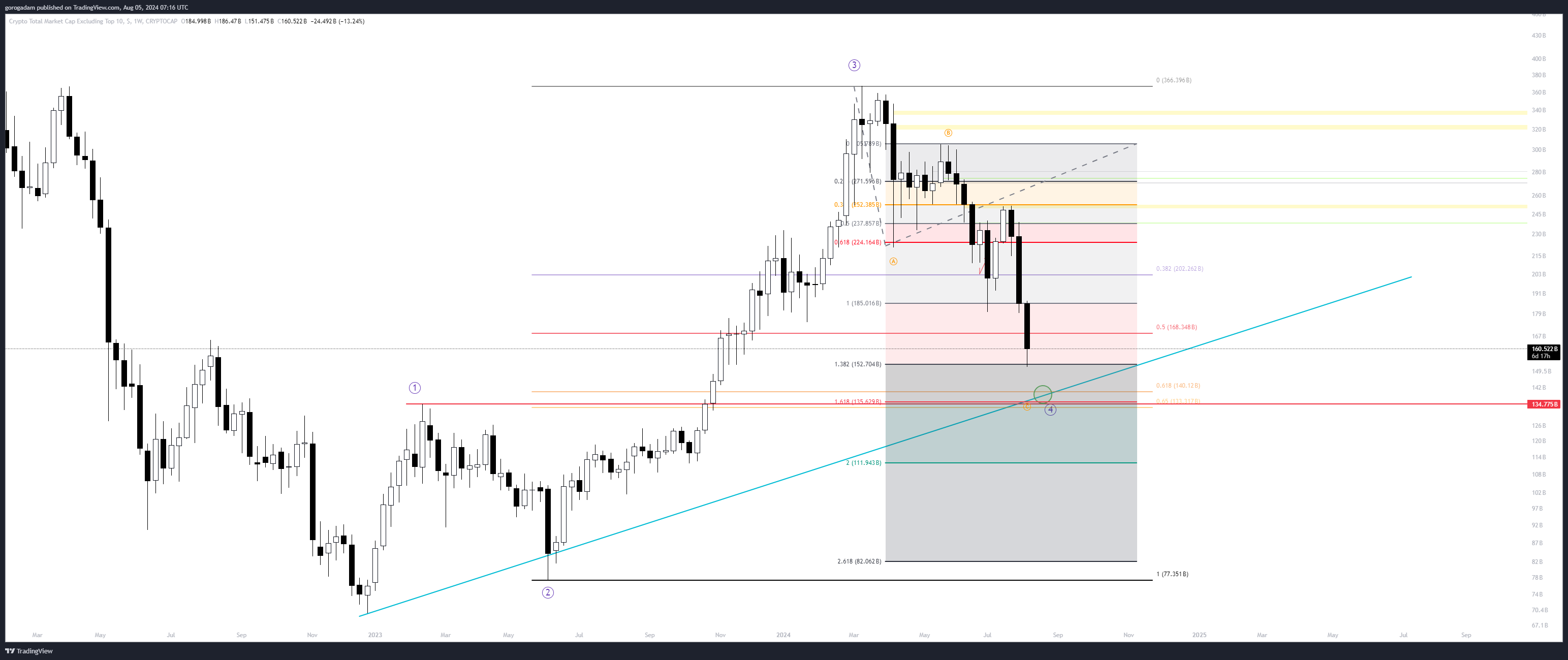 OTHERS elemzés – HTF helyzet: az altok indexe még több fájdalmat mutat, van egy szép egybeesés 135-140B körül (1. hullám csúcsa + 1.618-as meghosszabbítása az első korrekciós hullámnak + golden pocketja a 3. hullámnak + trendvonal).