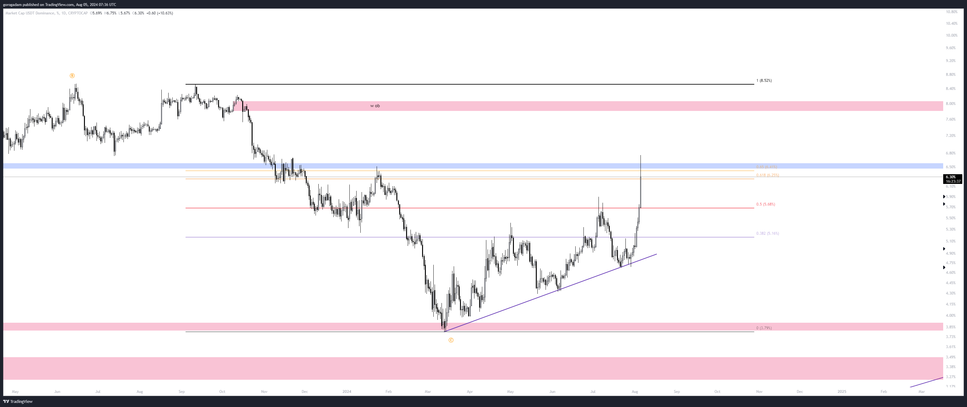 USDT.d elemzés – HTF helyzet: elérte az ETF bejelentés utáni piacciklus golden pocketját, most arra számítok, hogy itt zónázik egy darabig, ahogy először a BTC-be megy át a pénz, majd megindulhat lefelé (a piac emelkedését okozva).