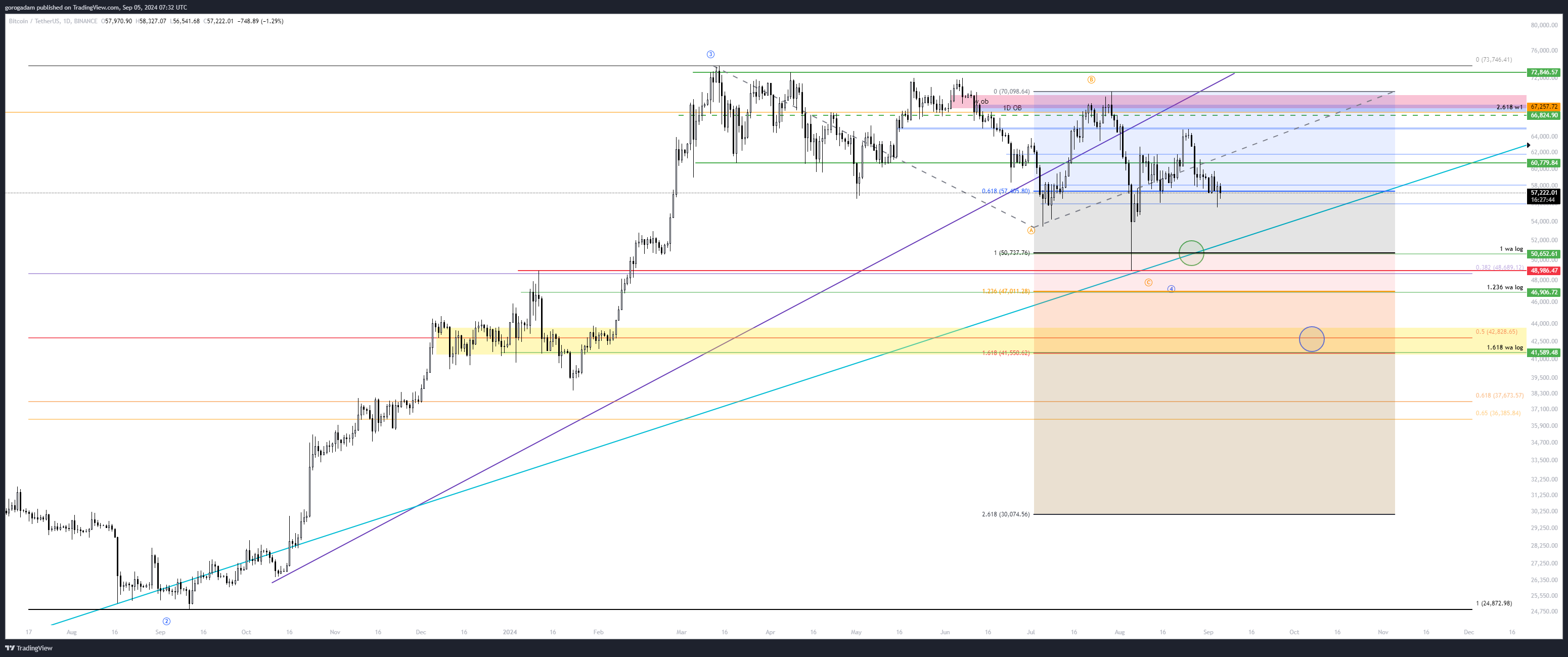 BTC elemzés – HTF helyzet: a fő céláram a BTC-nél a 46 900$, ami kicsivel a legutóbbi alj alatt van, és az 1.236-os extenziója lenne (log charton) a korrekció A hullámának, egyben ezzel kicsivel a 0.382-es (logaritmikus) FIB szintje alatt lennénk a III. hullámnak.