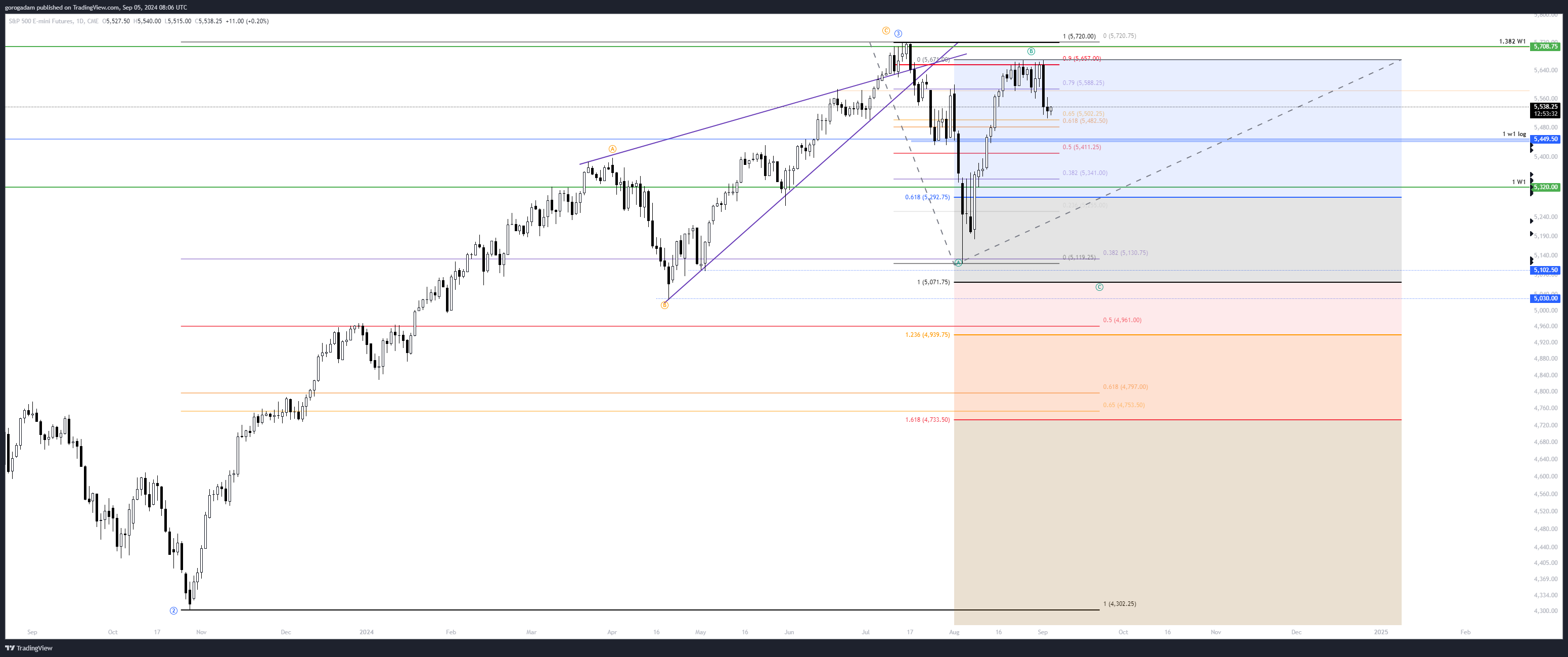 Eközben szerintem egy Wyckoff disztribúció zajlik, ha igen, akkor most egy medvés visszateszt jönne, majd elkezdődhet az igazi korrekció, várhatóan kb 5071-ig (regular flat korrekciónál az A és C hullámok egyenlőek szoktak lenni).