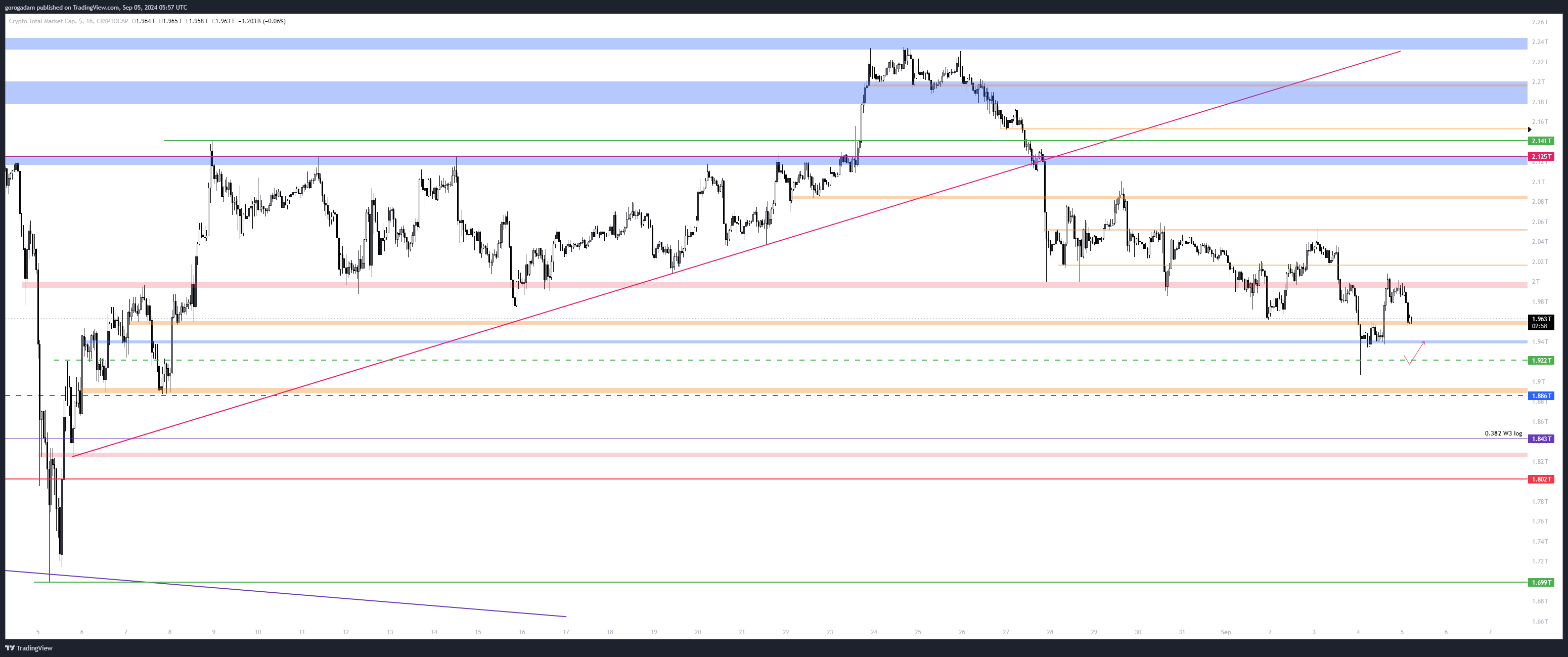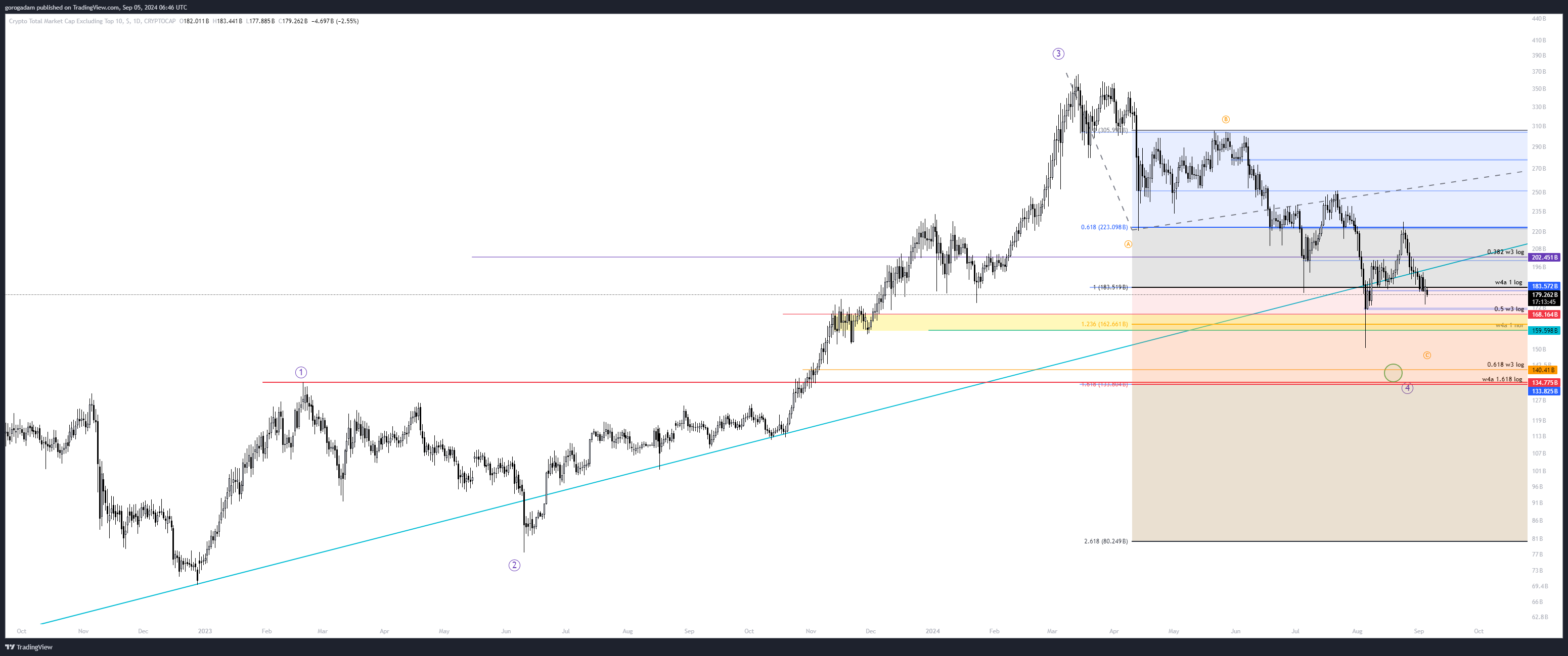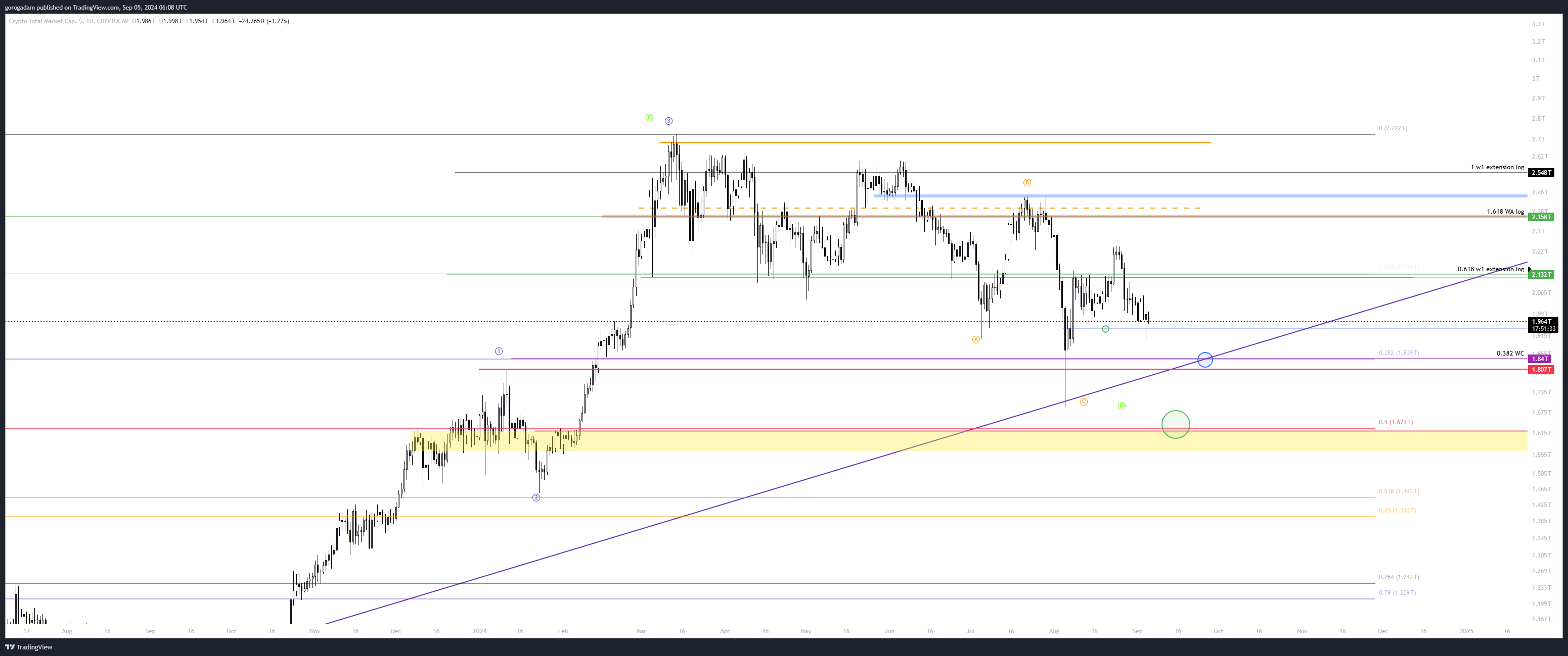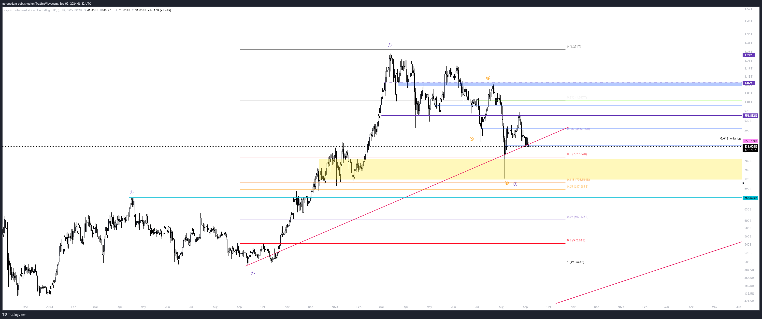 TOTAL2 elemzés – HTF helyzet: a nagy leszakadás átszúrta a sárga konszolidációs időszakot, de egyszerűen egy ilyen esés nem alkalmas arra, hogy sok likviditást szedjen fel a piac, ráadásul maradt egy gigantikus kanóc is lefelé.