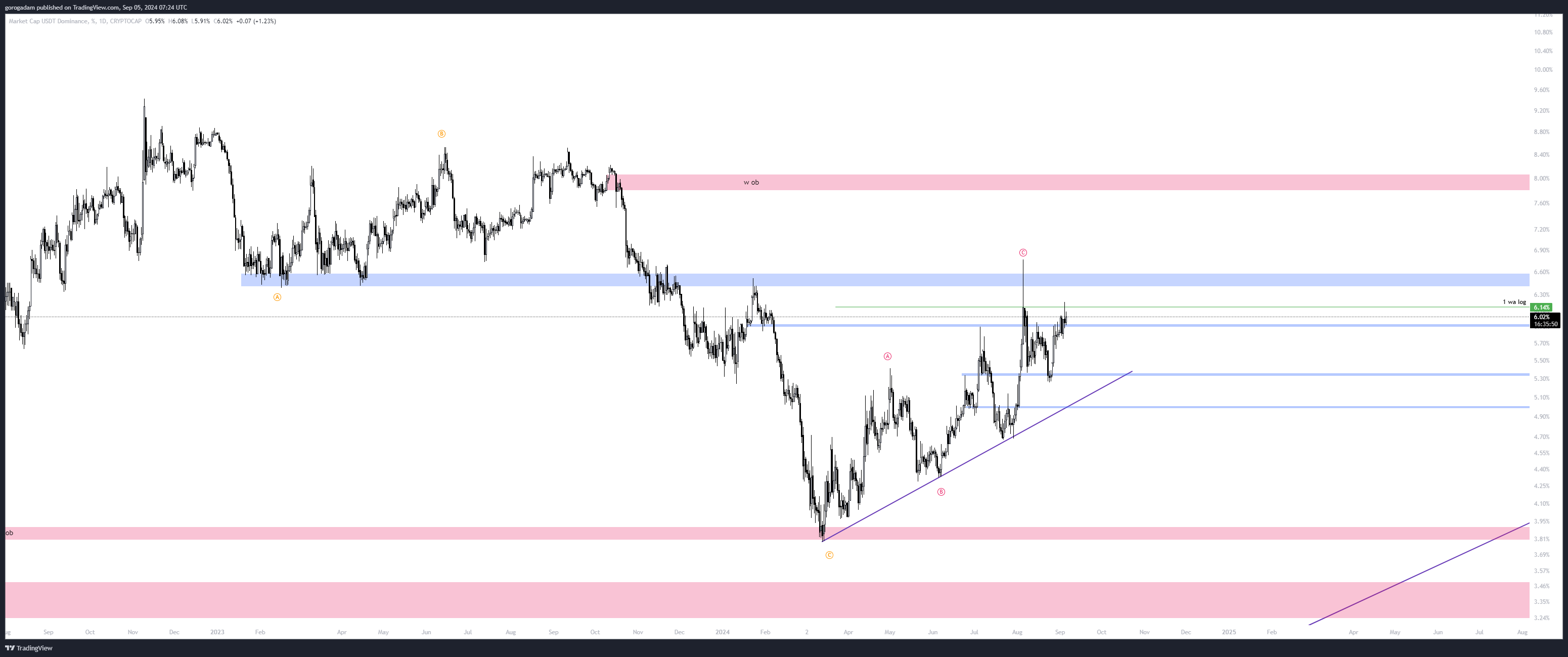 USDT.d elemzés – HTF helyzet: Úgy néz ki, hogy a lila trendvonal megtörése jelzi majd a IV. hullám végét, addig igazából az USDT.d annyira sok cselekedhető jelet nem ad szerintem.