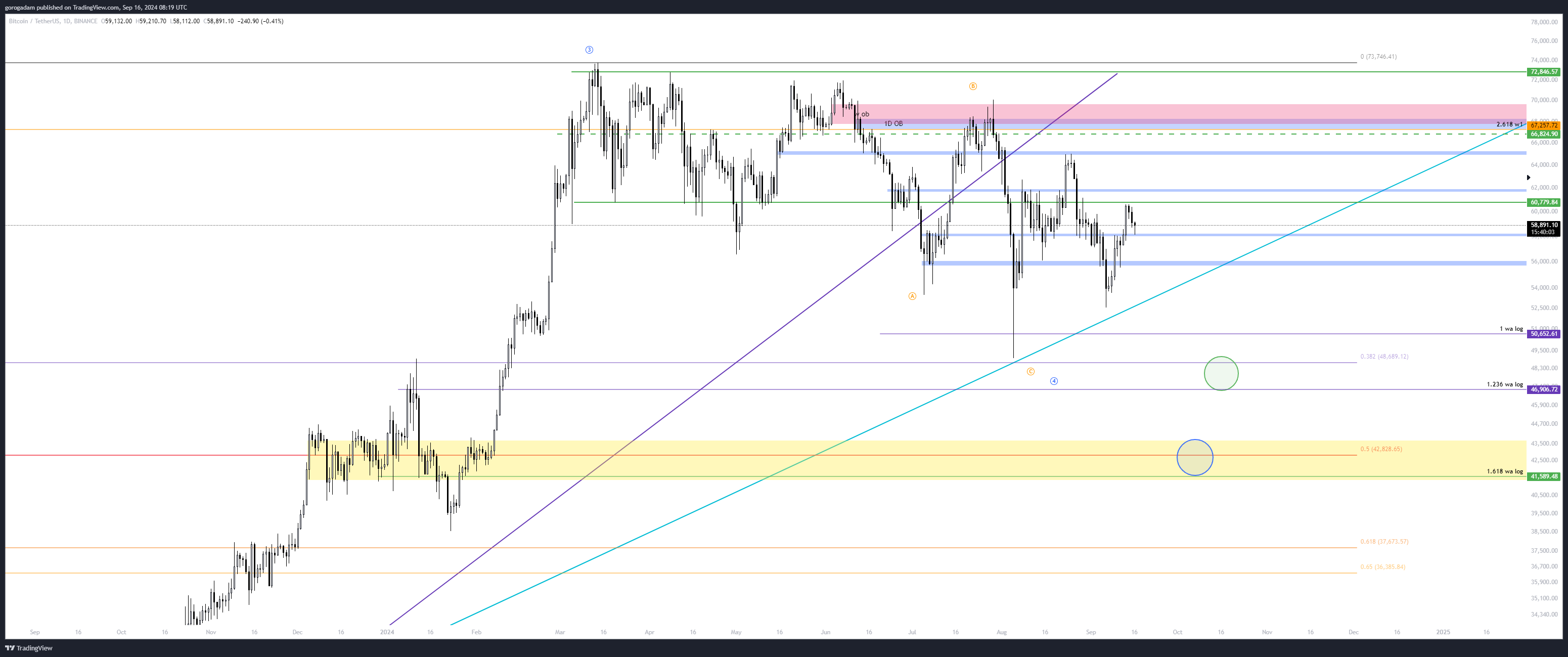 BTC elemzés – HTF helyzet: a fő céláram a BTC-nél a 46 900$, ami kicsivel a legutóbbi alj alatt van, és az 1.236-os extenziója lenne (log charton) a korrekció A hullámának, egyben ezzel kicsivel a 0.382-es (logaritmikus) FIB szintje alatt lennénk a III. hullámnak.