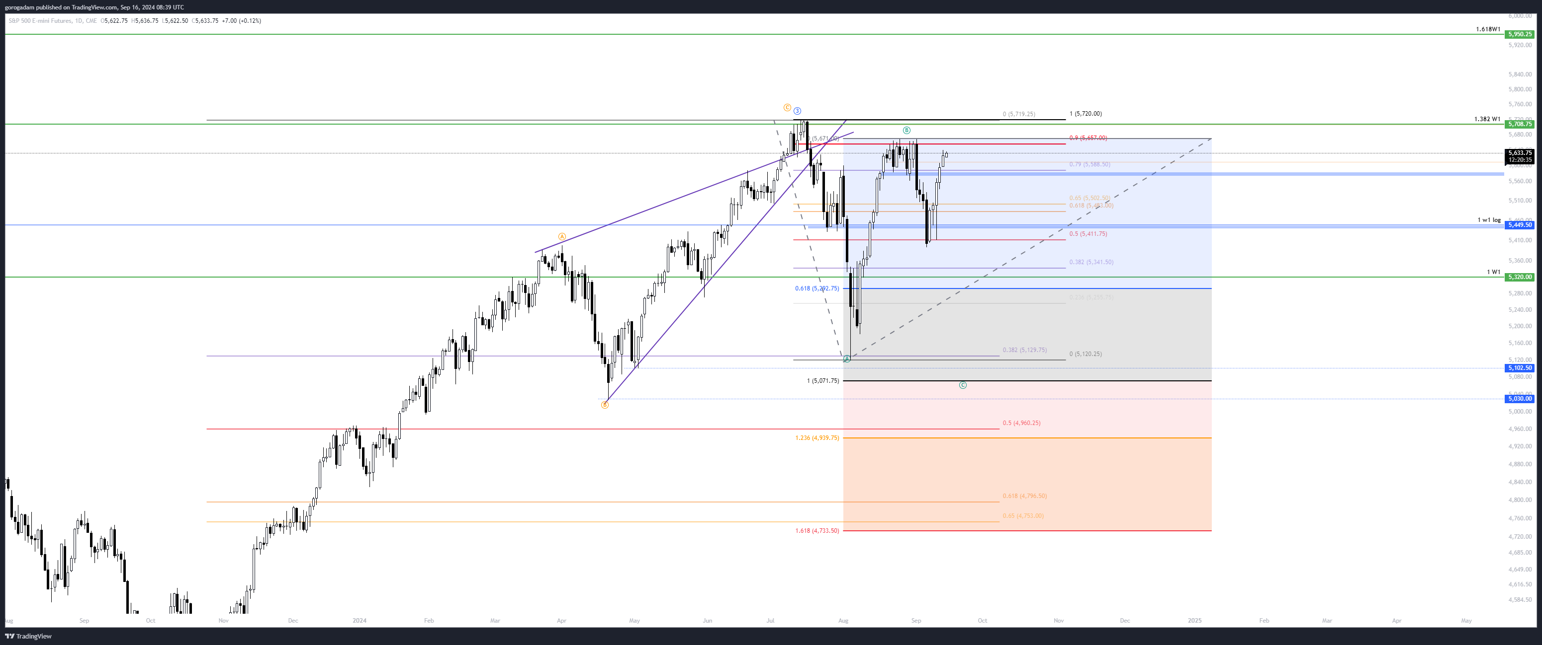 Továbbra is csak a zöld zónára koncentrálok, ami szerintem egy Wyckoff akkumuláció lesz. Az V. hullám kezdetét akkor tudjuk kijelenteni, ha meggyőzően kitör ebből a zónából, és akkor ismét buy high, sell higher piac jön. A hamis kitörés már megvolt (az augusztus 23-ai mozgás), ezért a következő szinte biztosan igazi lesz már.