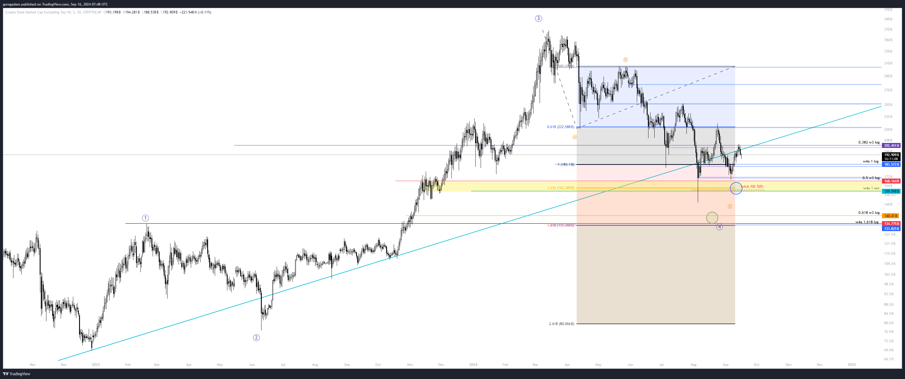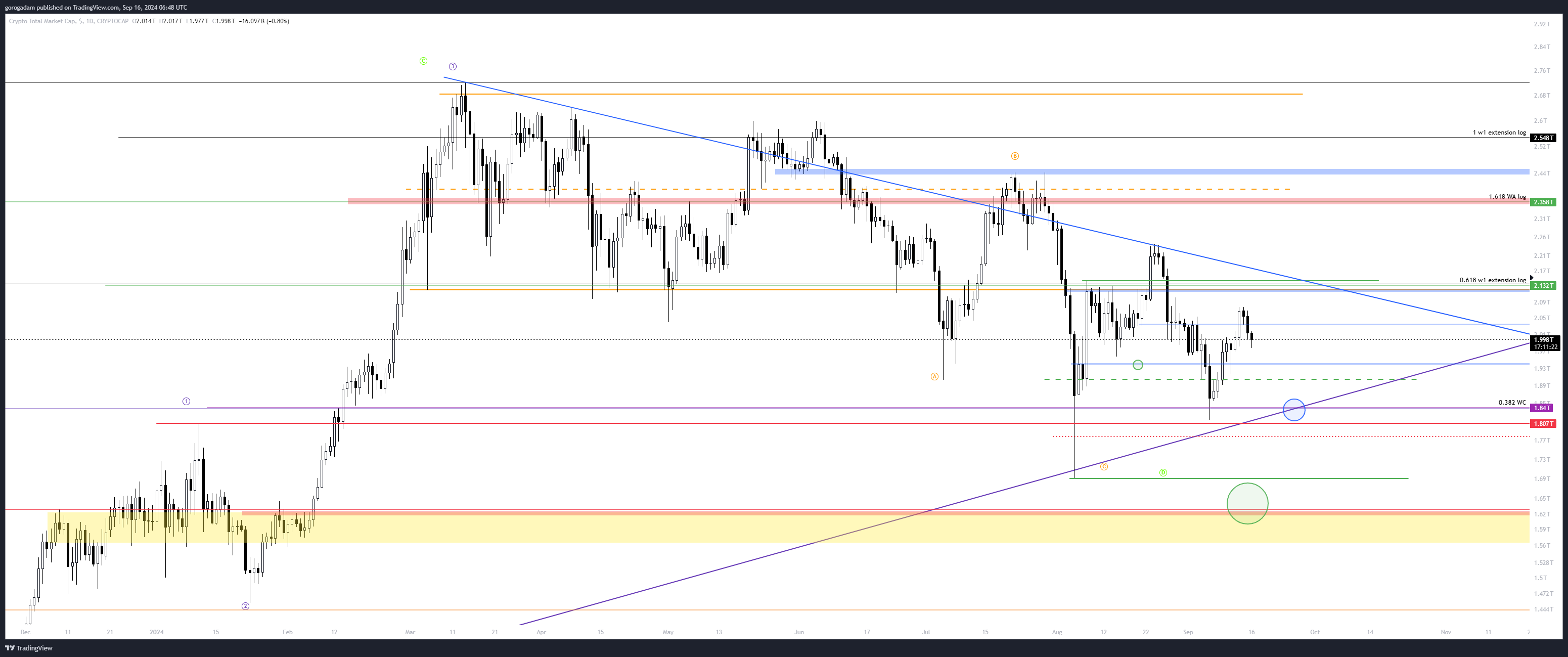 TOTAL2 elemzés – HTF helyzet: a nagy leszakadás átszúrta a sárga konszolidációs időszakot, de egyszerűen egy ilyen esés nem alkalmas arra, hogy sok likviditást szedjen fel a piac, ráadásul maradt egy gigantikus kanóc is lefelé.