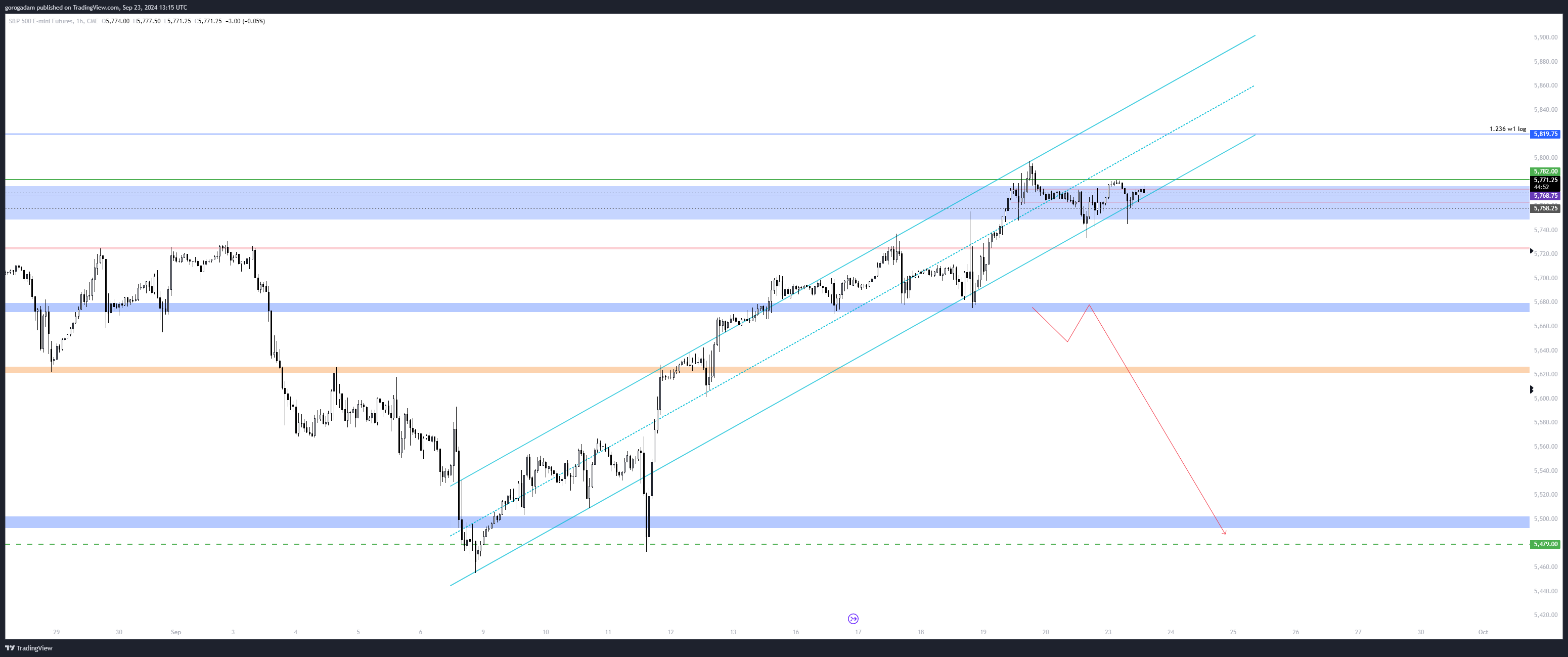 S&P 500 elemzés – LTF helyzet: a világoskék csatorna szerintem egy olyan short trigger, amit mindenképp érdemes megkockáztatni értelmes összeggel (nem túl sokkal), egy megerősítés lenne az 5750-es szint elvesztése, vagy a kettő közül valamelyiknek az ellenállássá válása.