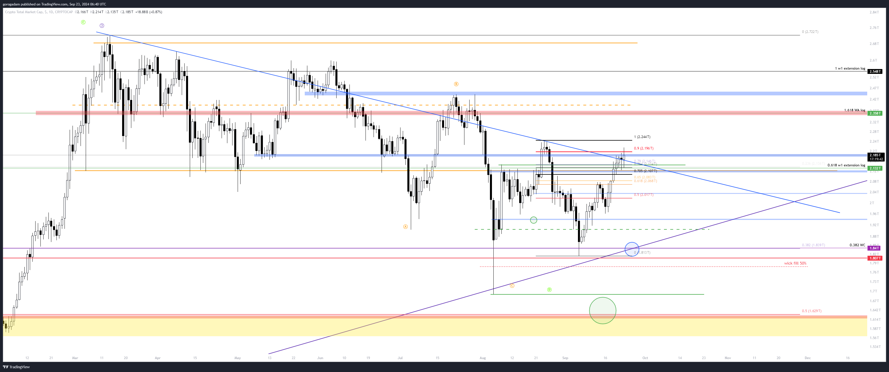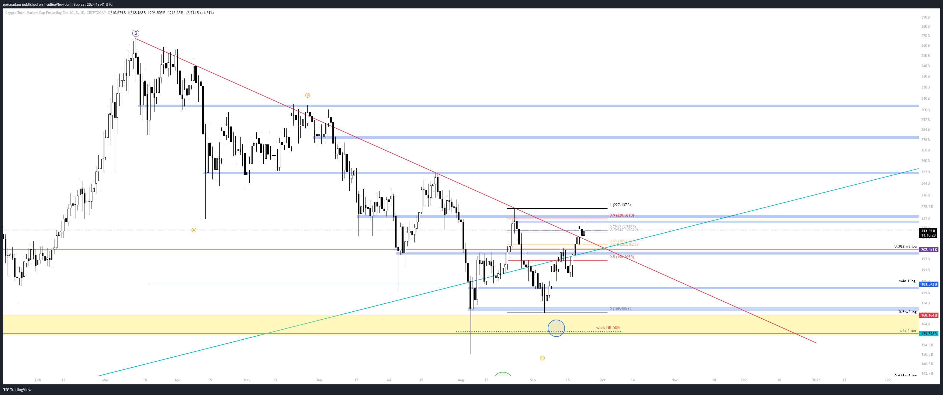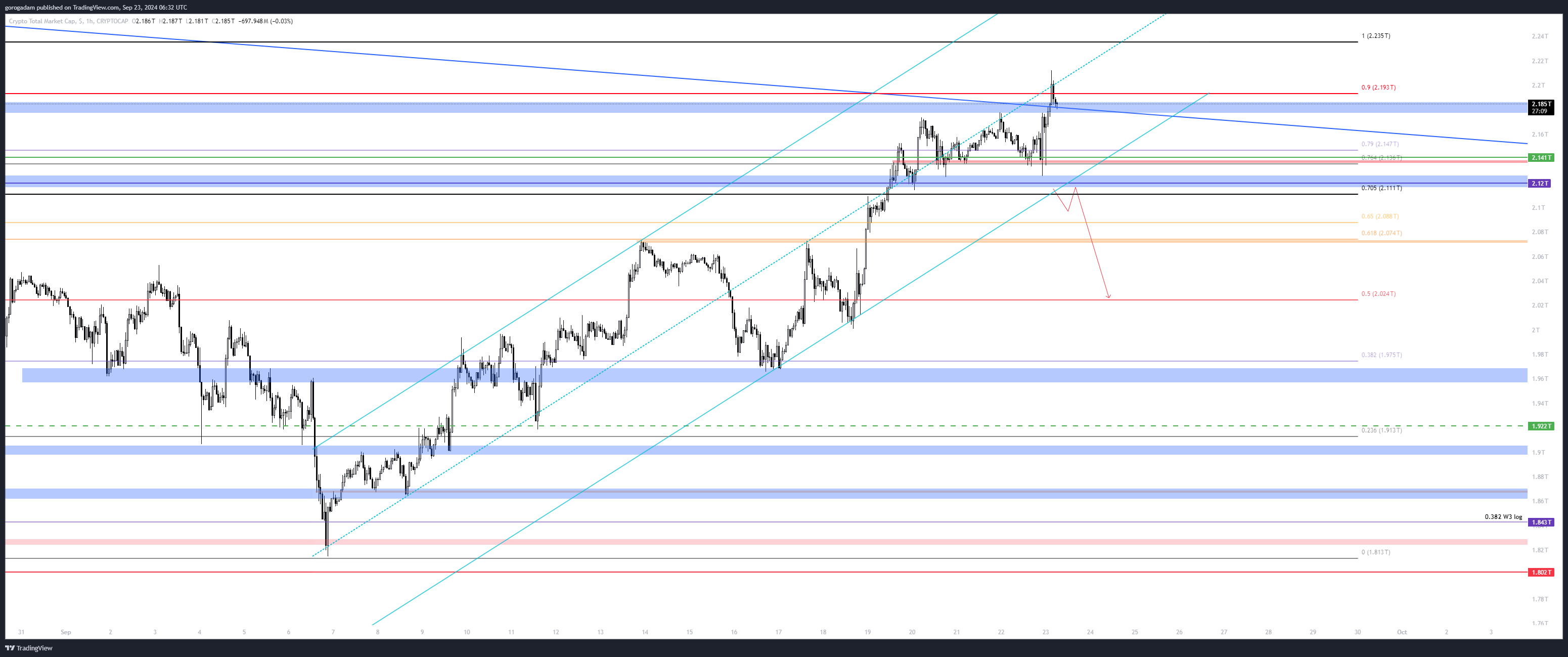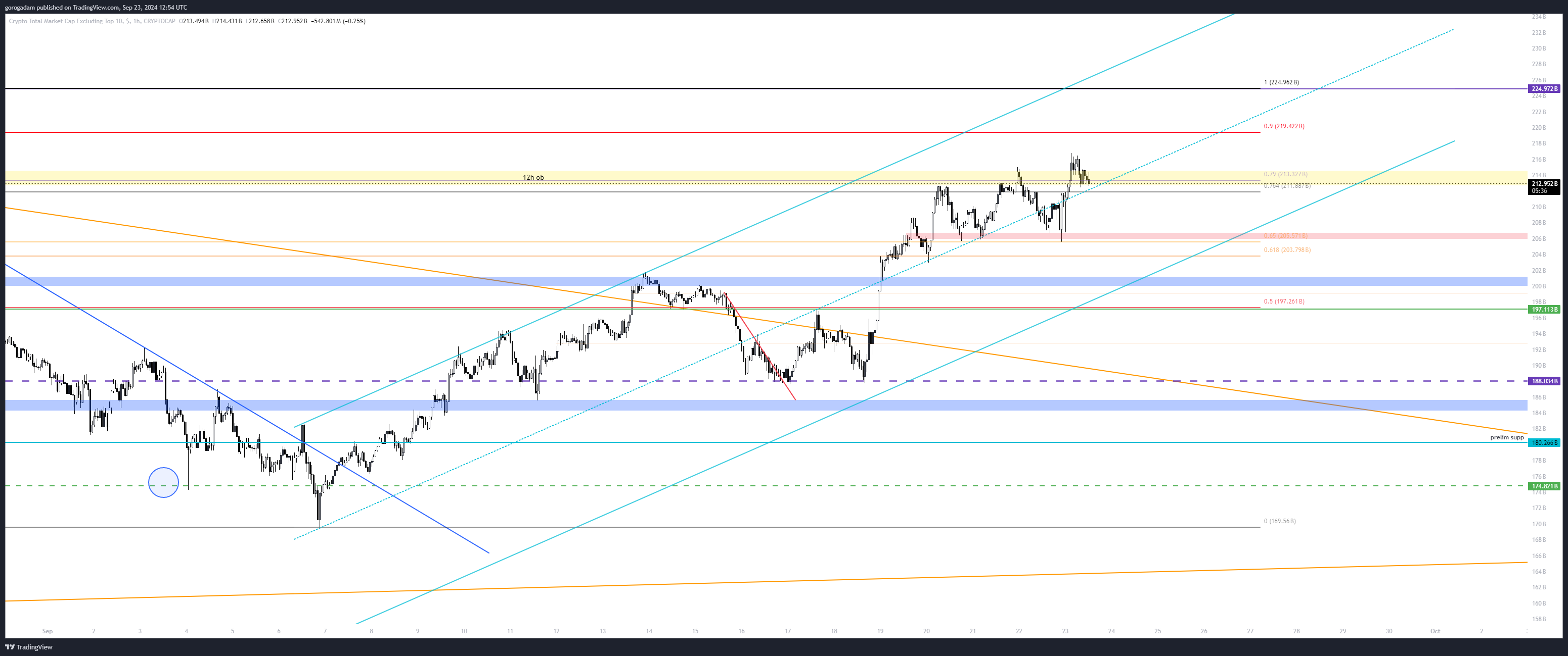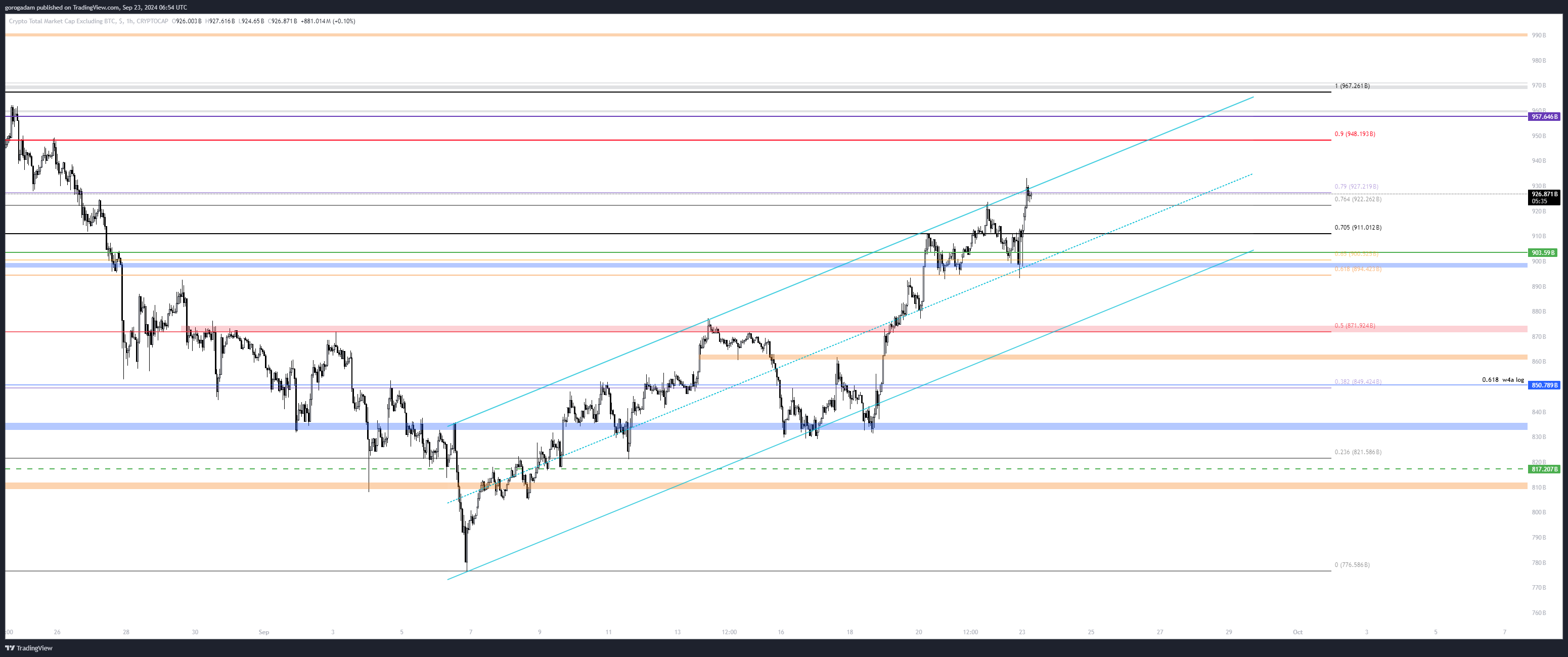 TOTAL2 elemzés – LTF helyzet: elérte a legutóbbi esés 0.79-es fib szintjét (normál chart), egyben a világoskék csatorna tetejét. Egy visszahúzás legalább esedékes, ennek a célára szerintem a 870B-s szint lehetne, majd 830B.