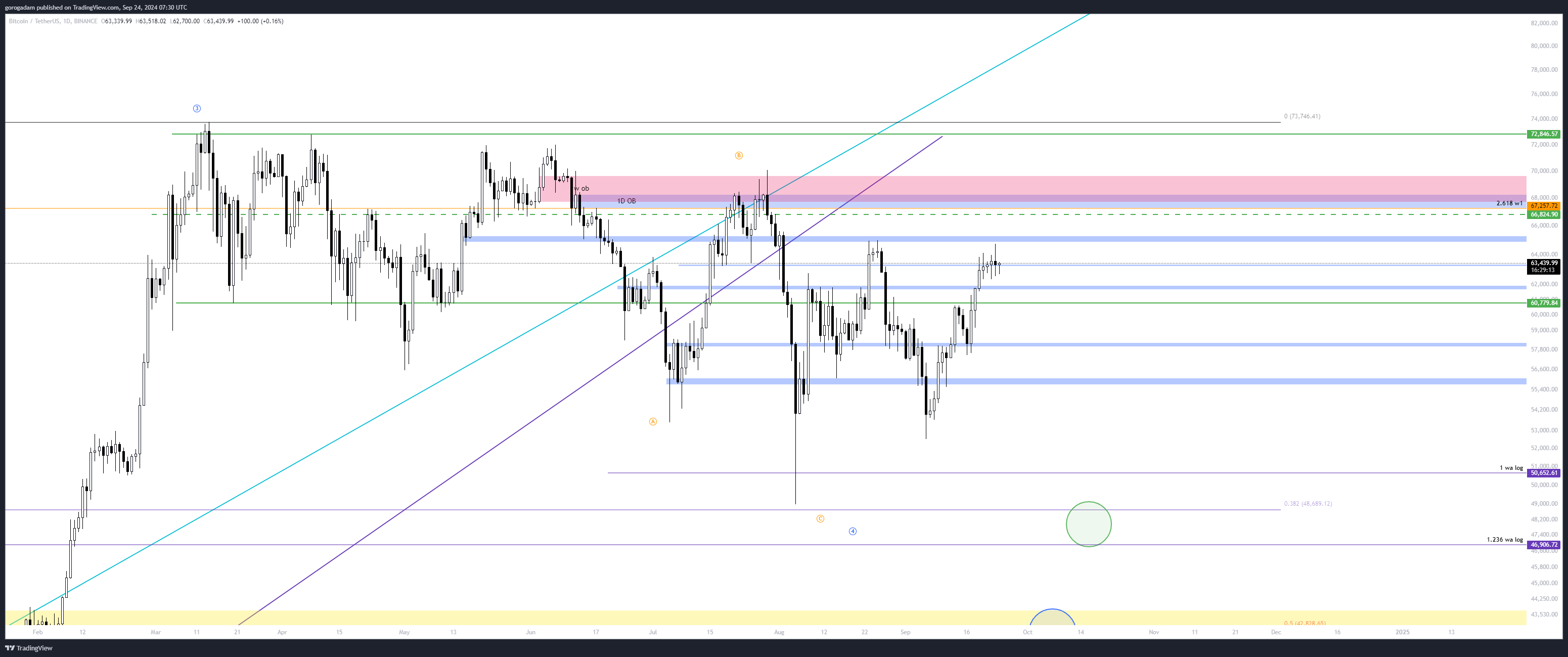 BTC elemzés – HTF helyzet: a fő céláram a BTC-nél a 46 900$, ami kicsivel a legutóbbi alj alatt van, és az 1.236-os extenziója lenne (log charton) a korrekció A hullámának, egyben ezzel kicsivel a 0.382-es (logaritmikus) FIB szintje alatt lennénk a III. hullámnak.