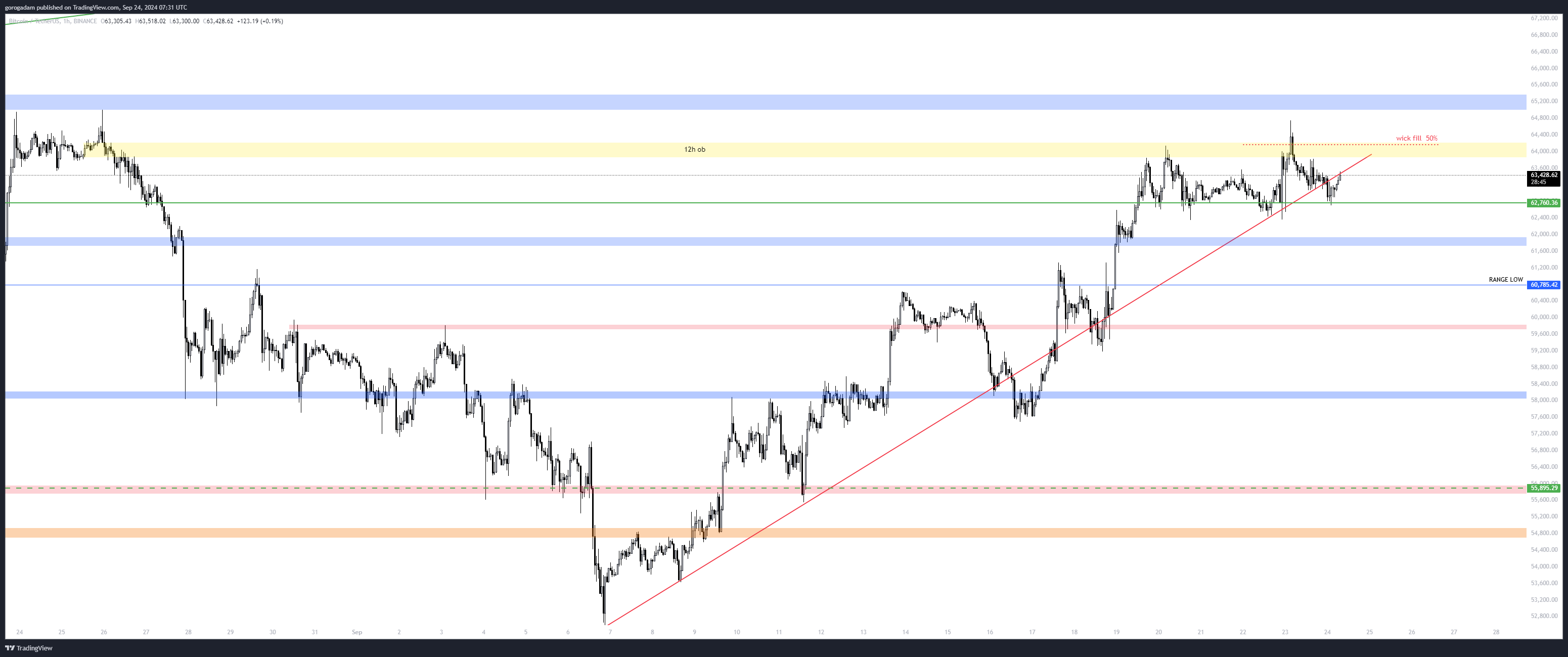 BTC elemzés – LTF helyzet: nem kell túlbonyolítani, igazából, ha 62760 alá esik tartósan, vagy ellenállássá válik, akkor short, az első célár 59800 lenne.