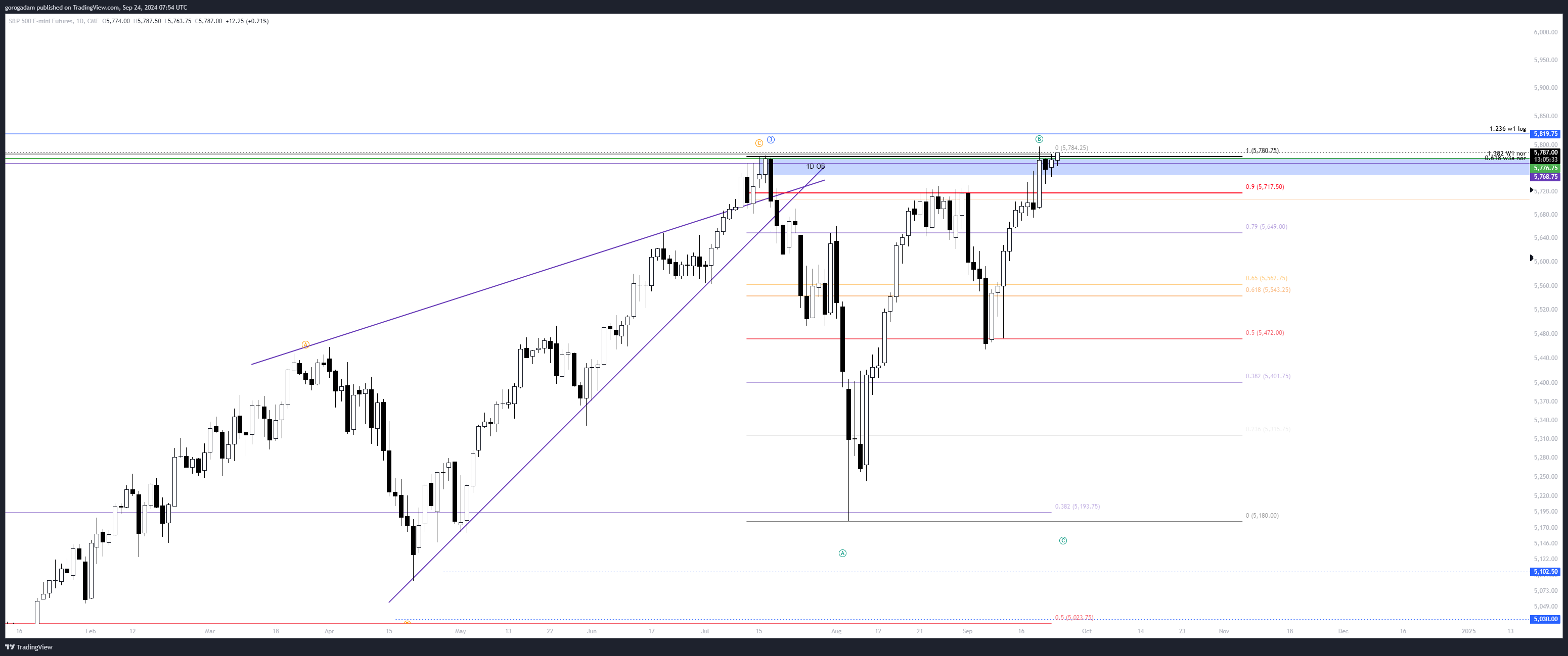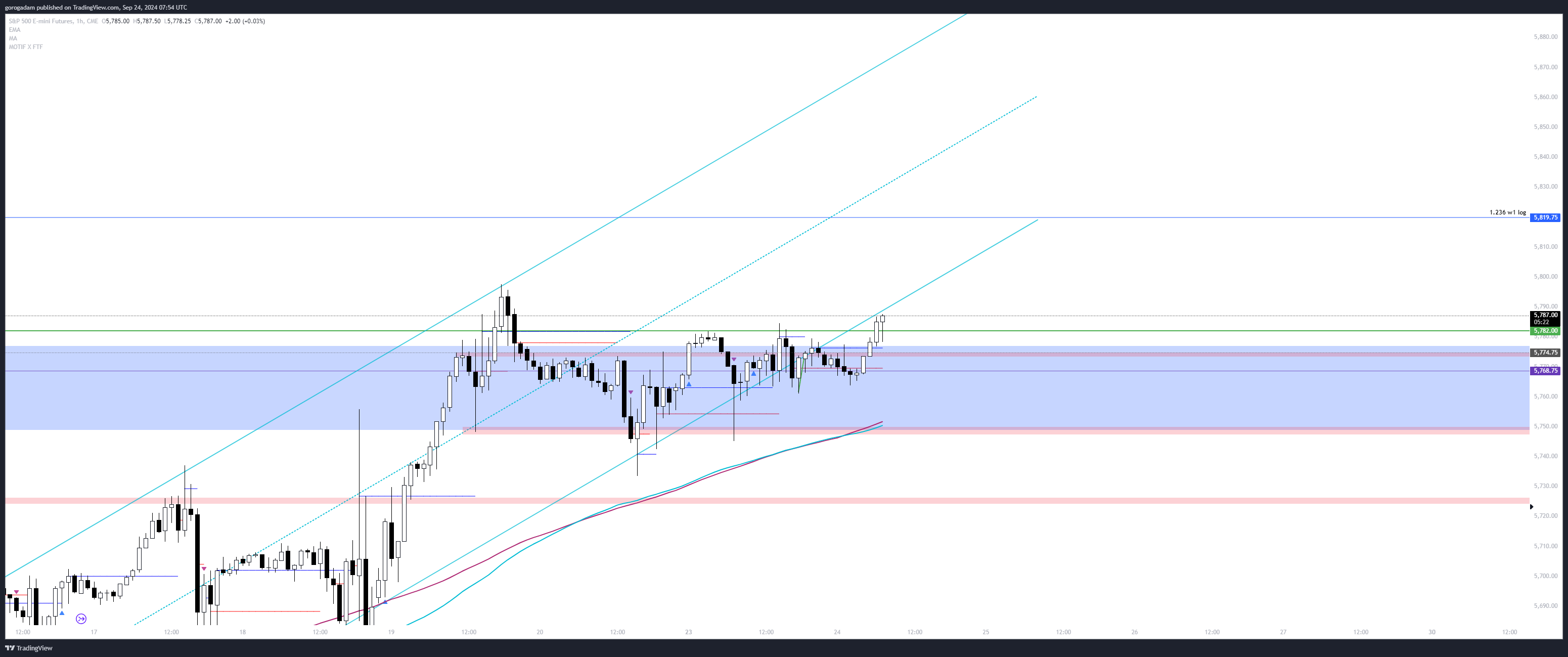 S&P 500 elemzés – LTF helyzet: a világoskék csatorna szerintem egy olyan short trigger, amit mindenképp érdemes megkockáztatni értelmes összeggel (nem túl sokkal), egy megerősítés lenne az 5750-es szint elvesztése, vagy a kettő közül valamelyiknek az ellenállássá válása.