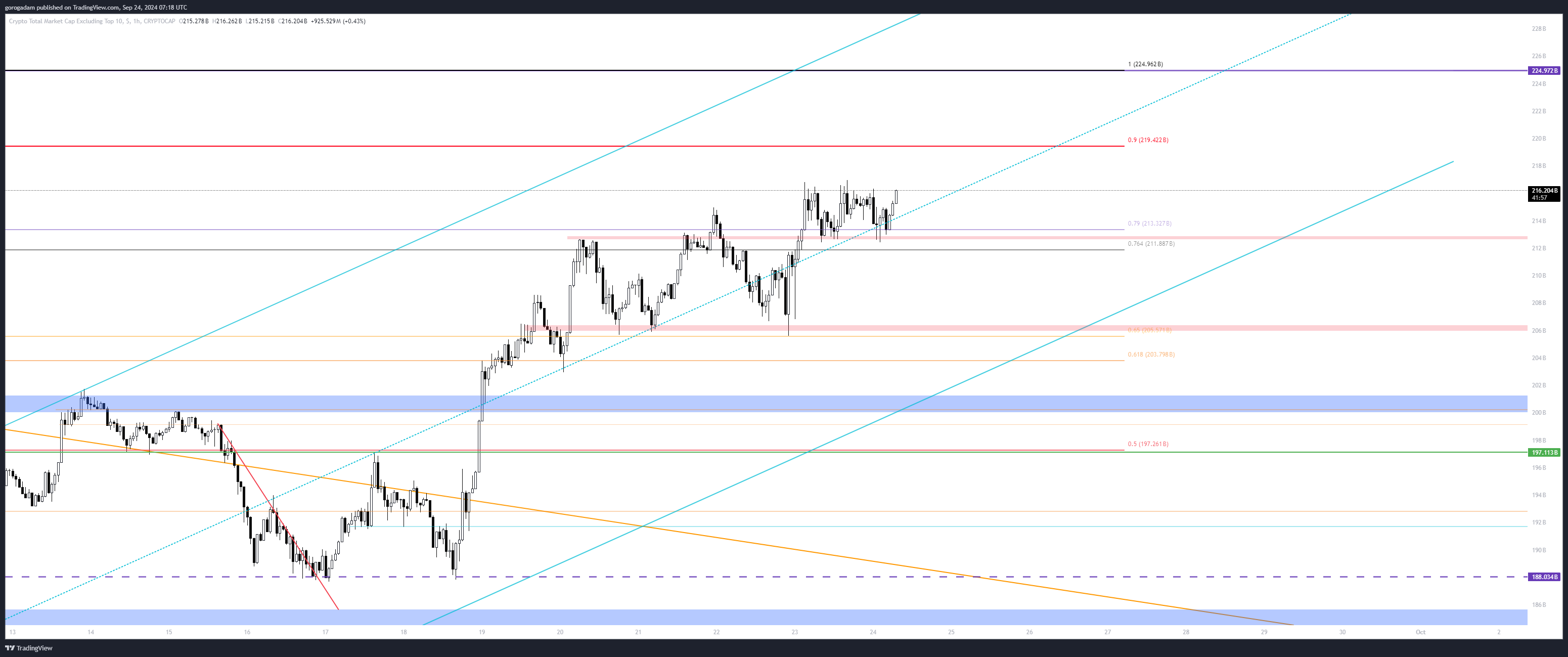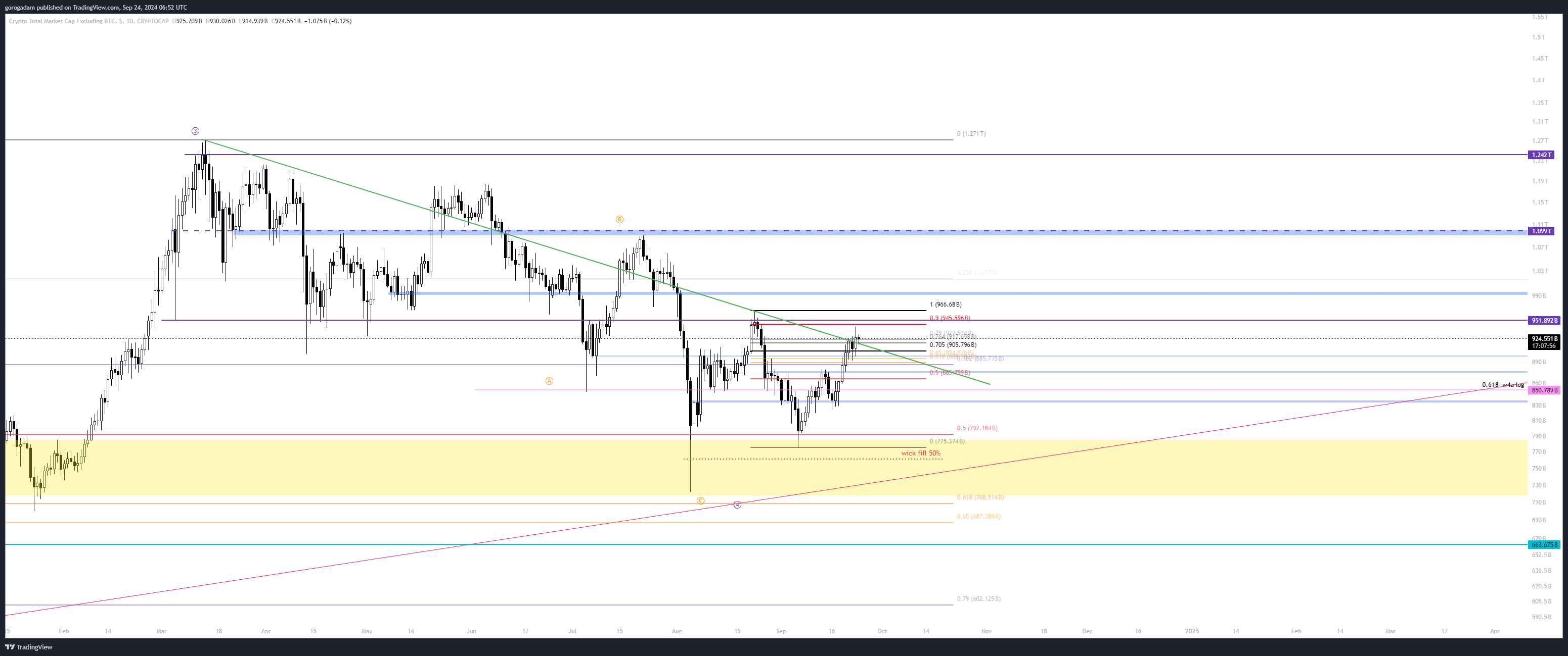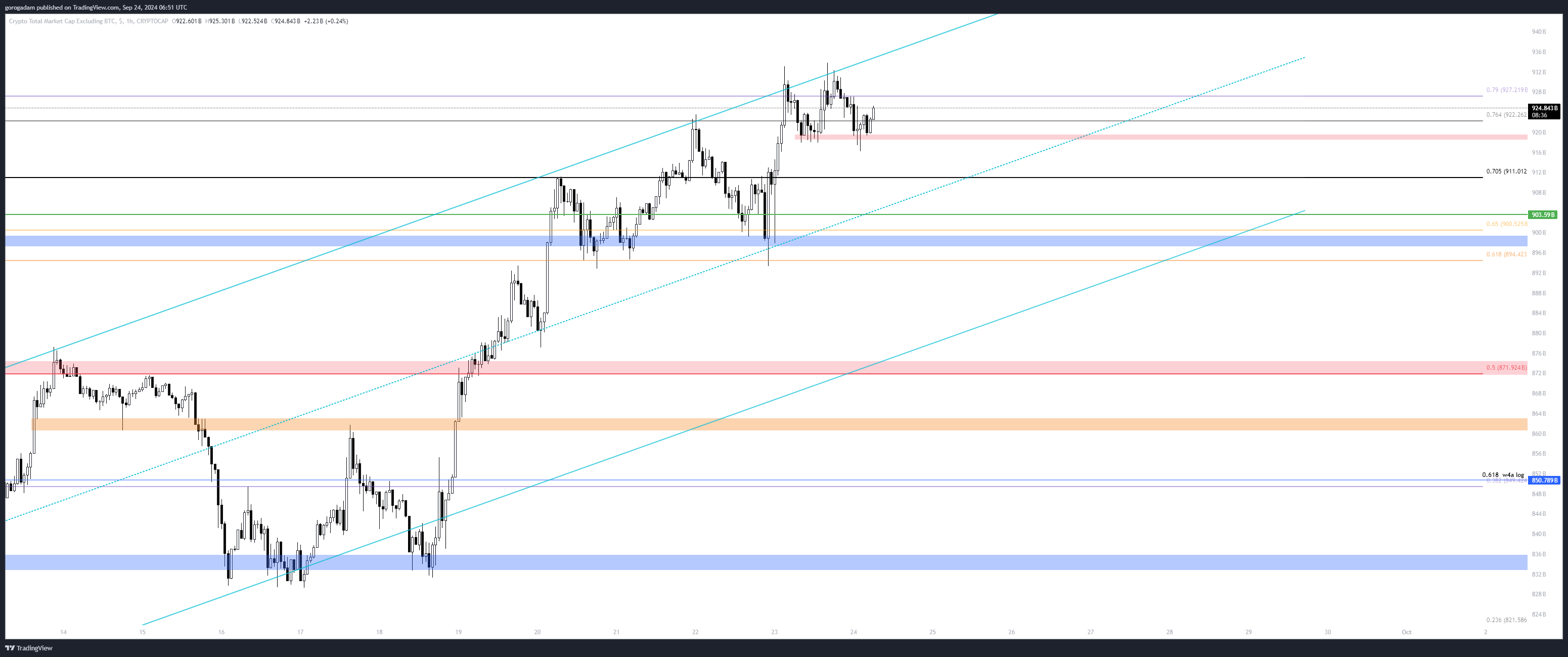 TOTAL2 elemzés – LTF helyzet: elérte a legutóbbi esés 0.79-es fib szintjét (normál chart), egyben a világoskék csatorna tetejét. Egy visszahúzás legalább esedékes, ennek a célára szerintem a 870B-s szint lehetne, majd 830B. Ennek az első jele a 918B-s piros szint letörése lenne.