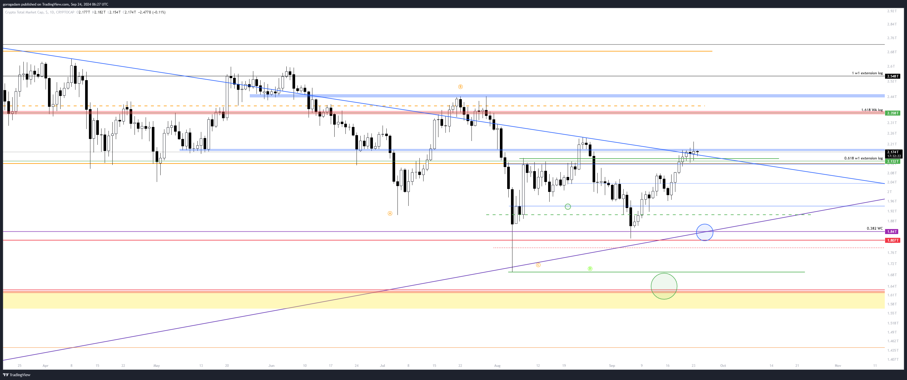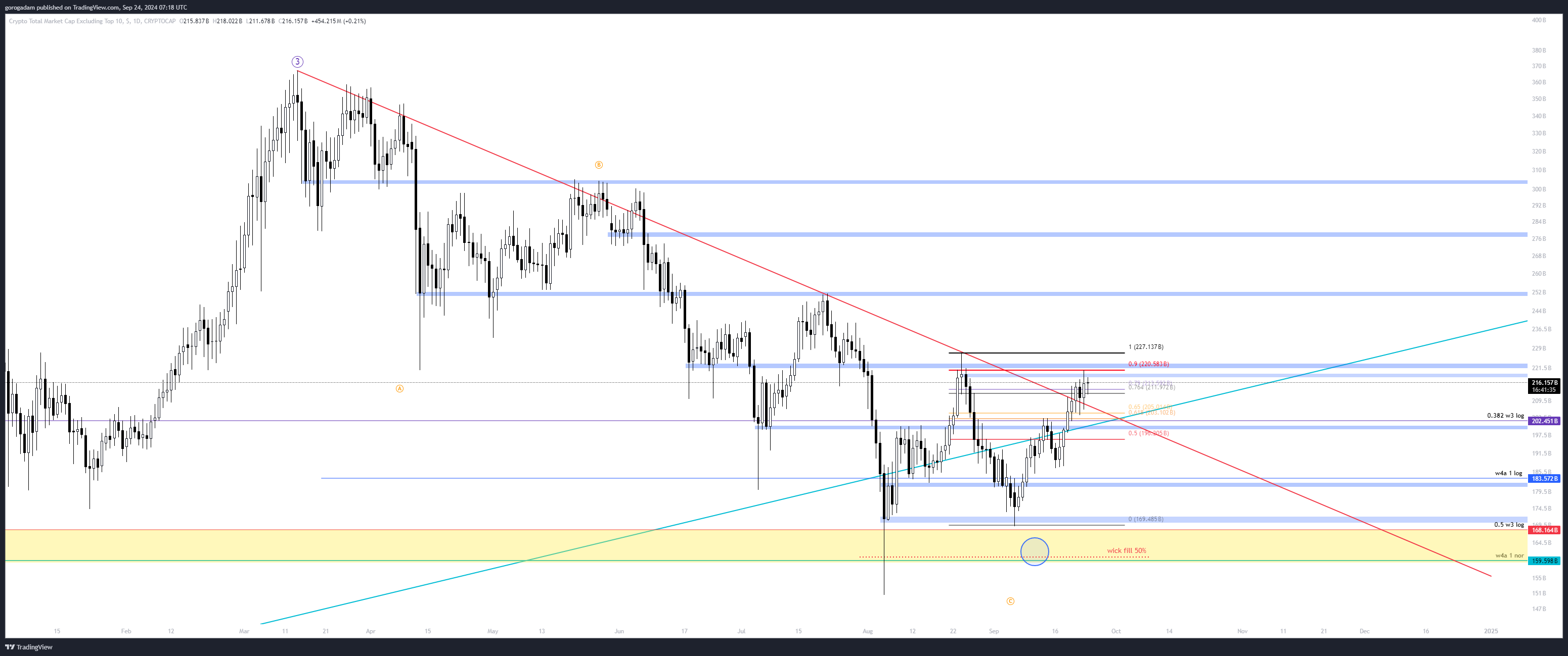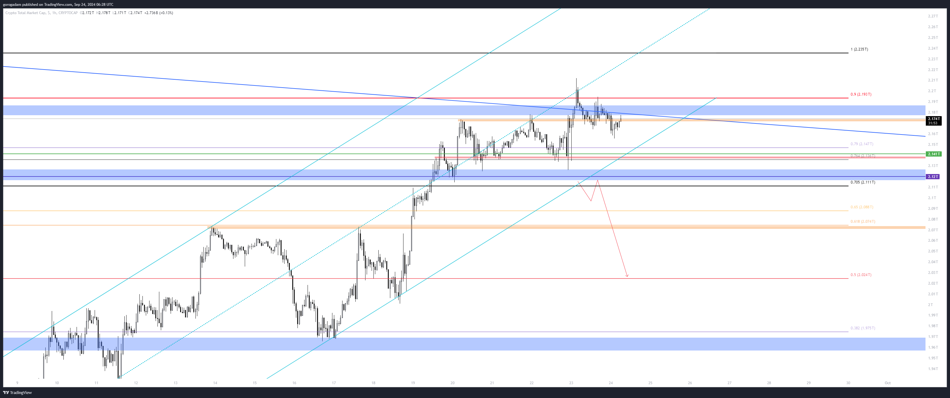 TOTAL2 elemzés – LTF helyzet: elérte a legutóbbi esés 0.79-es fib szintjét (normál chart), egyben a világoskék csatorna tetejét. Egy visszahúzás legalább esedékes, ennek a célára szerintem a 870B-s szint lehetne, majd 830B. Ennek az első jele a 918B-s piros szint letörése lenne.