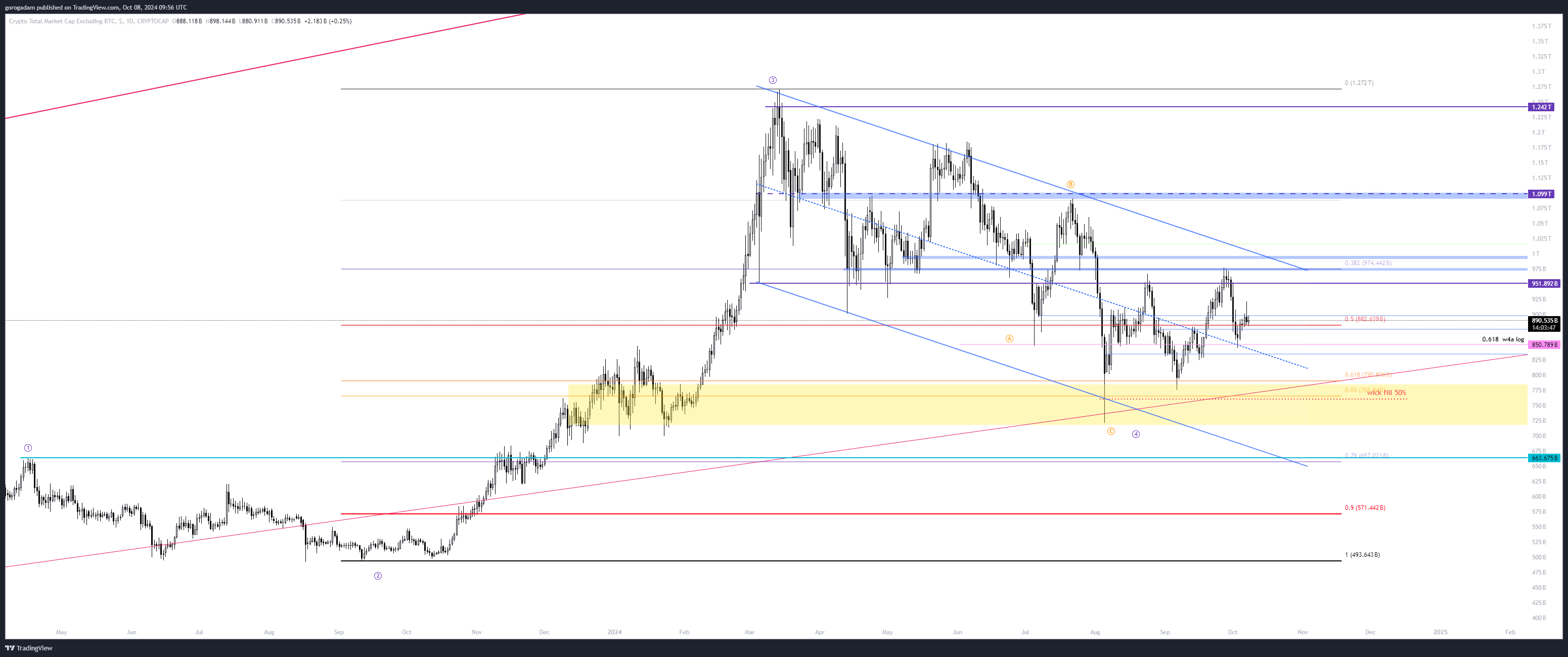TOTAL2 elemzés – HTF helyzet: most látszik nagyon tisztán, hogy a szeptember végi emelkedés vége a 0.382-es FIB szint és napos szint medvés visszatesztje volt (974B-nél).