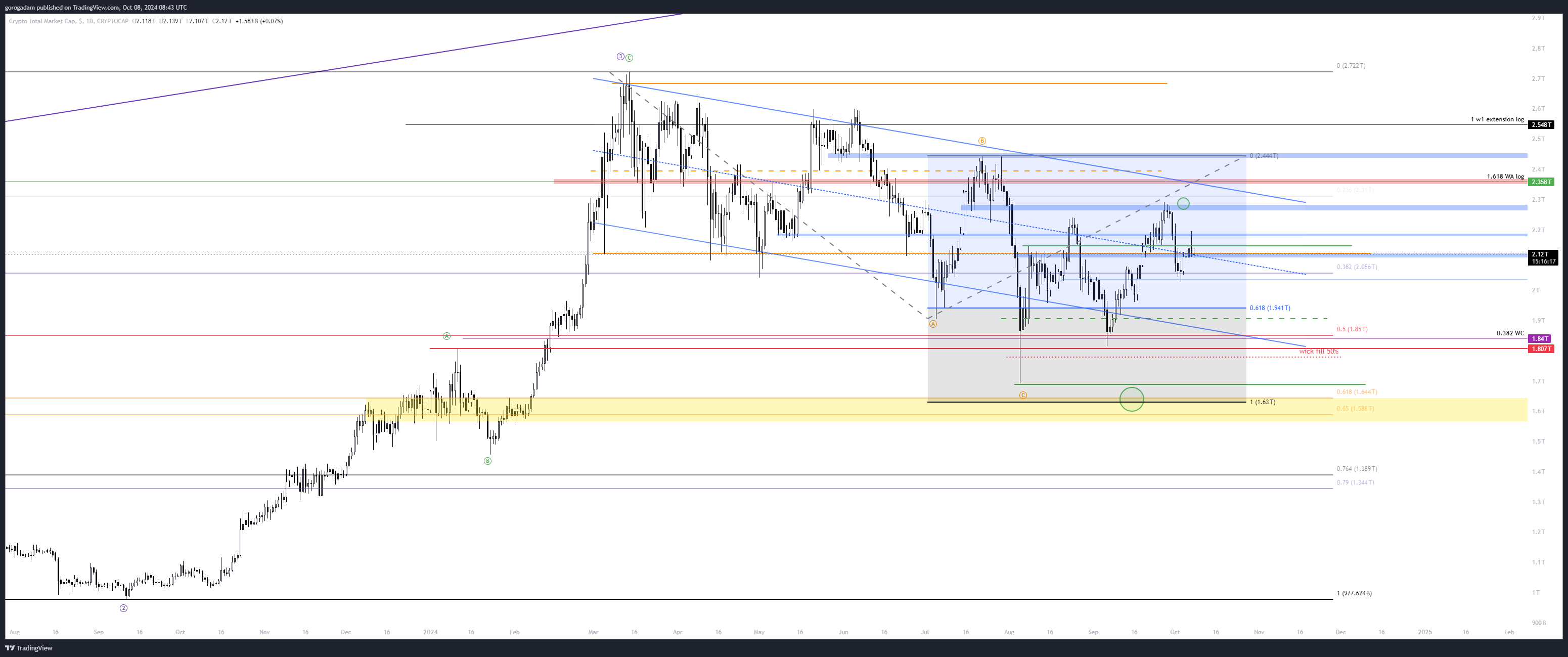 Ezúttal több helyen is NEM logaritmikus chartokat tettem be a HTF elemzésekhez, kicsit friss szemmel újranézve őket – ez alapján különösen tetszik az 1.63T szint, mint a III. hullám golden pocketja, az augusztusi alj kiütése, és egyben a december – januári konszolidáció visszatesztje.