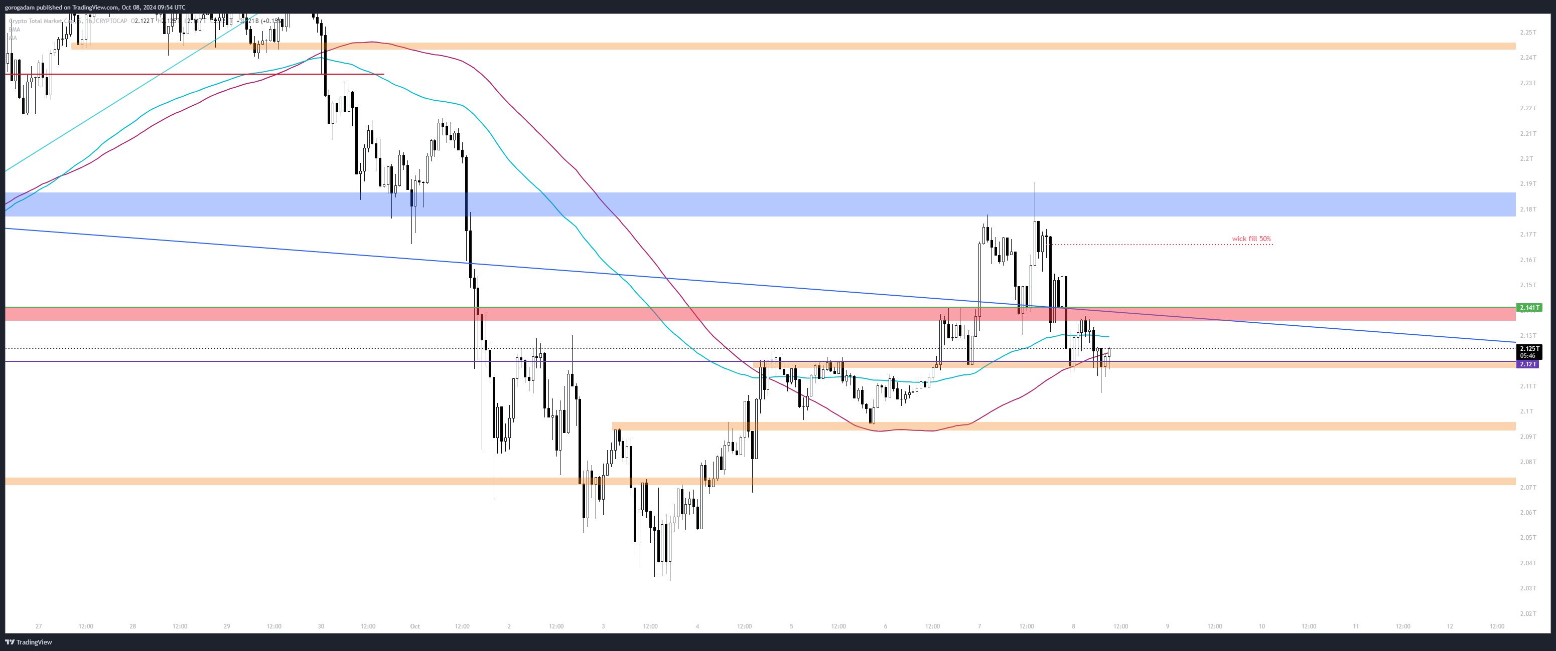 Ez arra utal, hogy a medvéknél az irányítás, és egy dolog aggaszt, a nagy kanóc felfelé hétfőről, amit lehet 50%-ig vagy teljesen betölt még a piac, mielőtt lefordul – a 2.12T-s szint elvesztése lenne short trigger így.