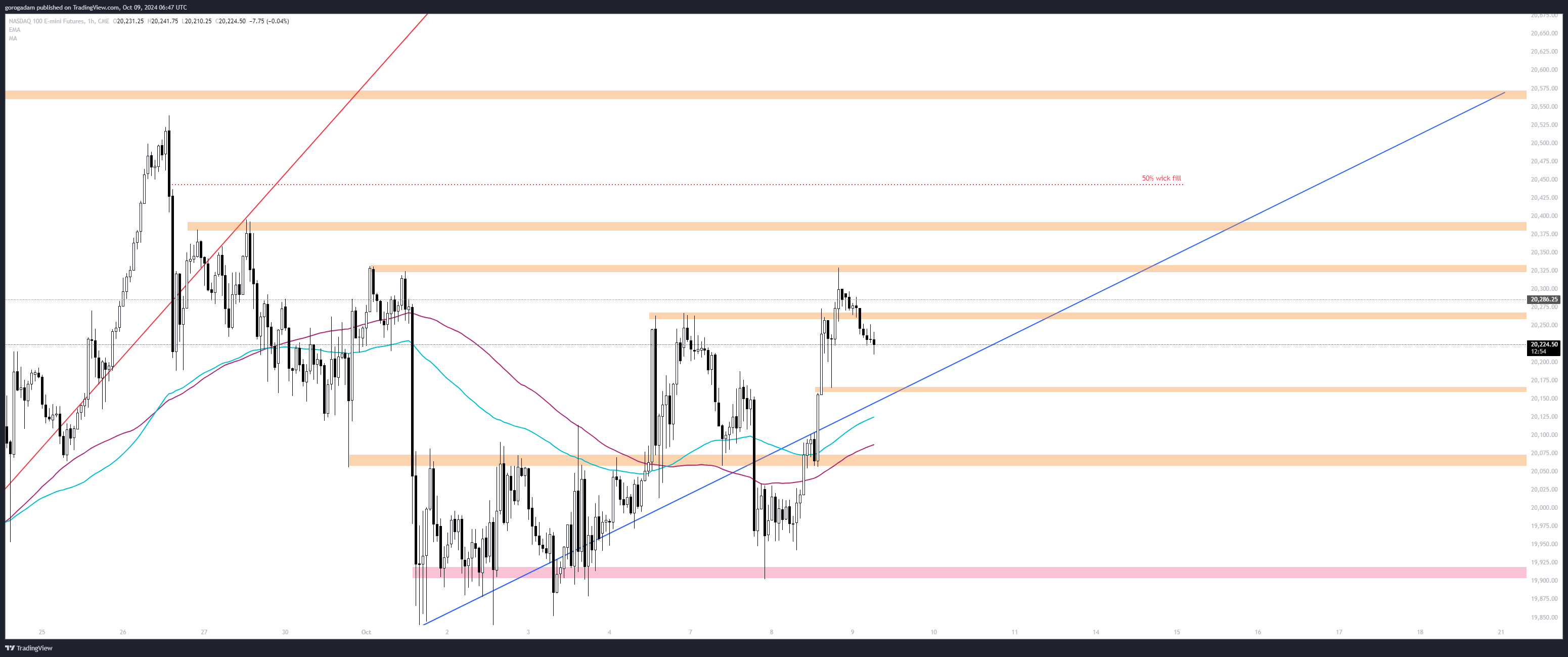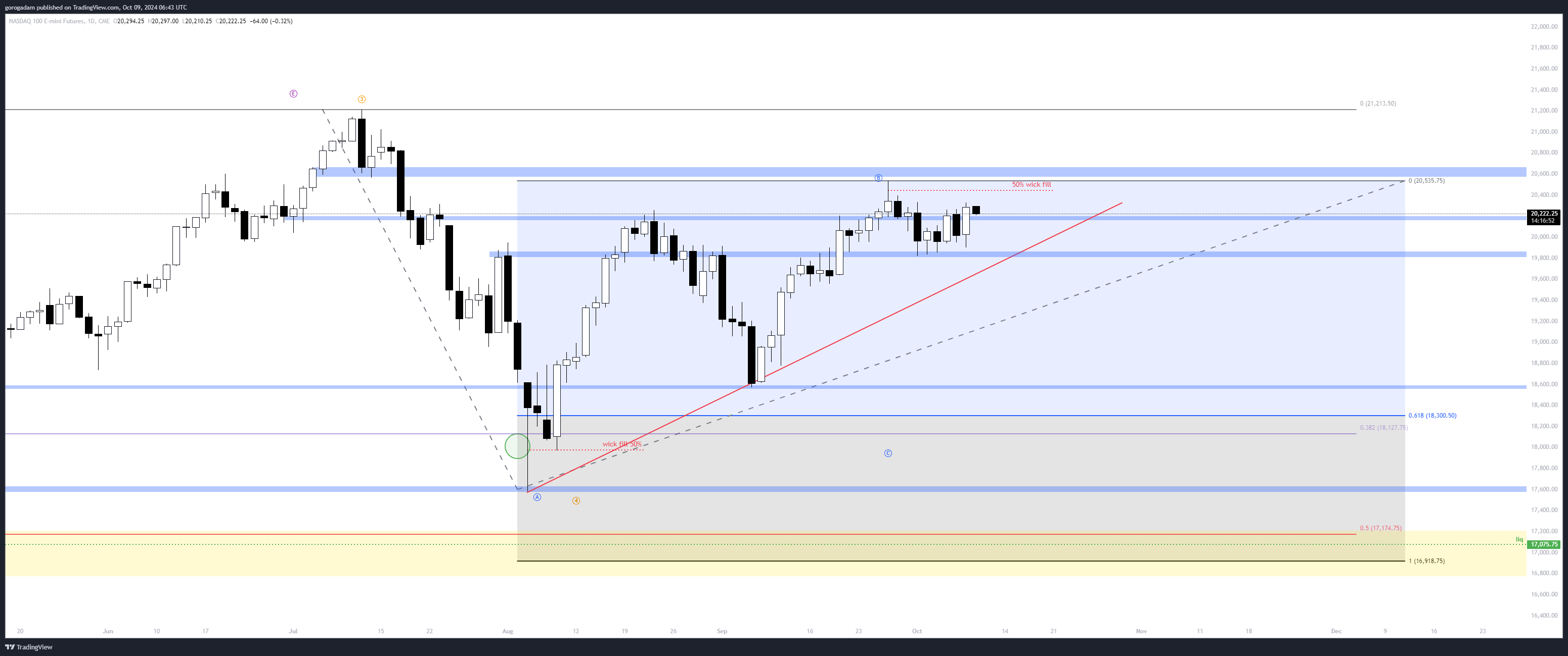 NQ elemzés – HTF helyzet: (megj: ezúttal normál, nem logaritmikus chartot oszottam meg lent) NQ-n a bikák elvesztették a 20 200-as szintet, sőt, ellenállássá is alakult most egyelőre, így most a medvéknél a kontroll.