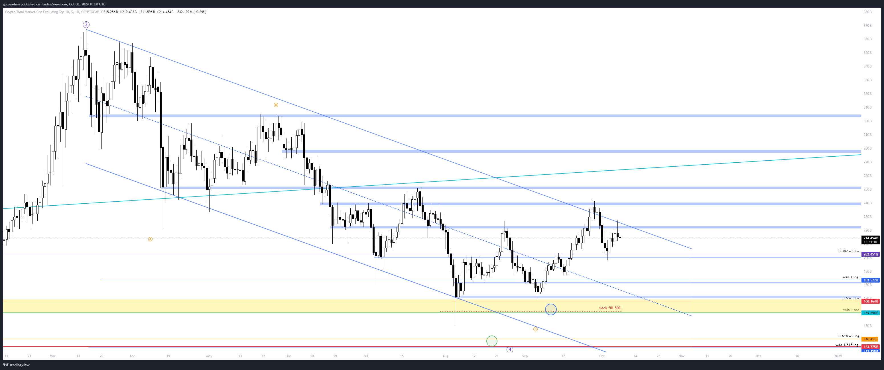 3, egy másik jelentős likviditás a sárgával jelölt korábbi konszolidáció újratesztje lenne, kriptóban láttuk, hogy ezt a III. hullám alatti konszolidációt még szereti visszatesztelni az árfolyam