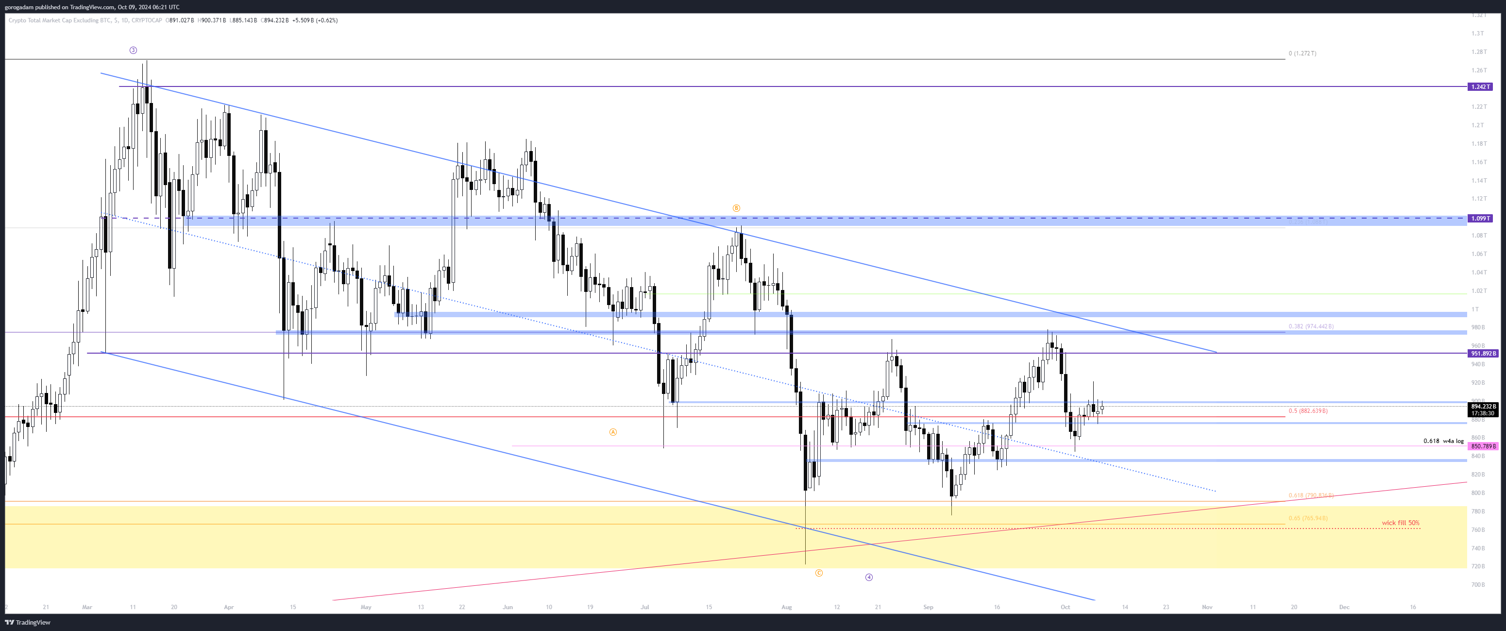 TOTAL2 elemzés – HTF helyzet: most látszik nagyon tisztán, hogy a szeptember végi emelkedés vége a 0.382-es FIB szint és napos szint medvés visszatesztje volt (974B-nél).