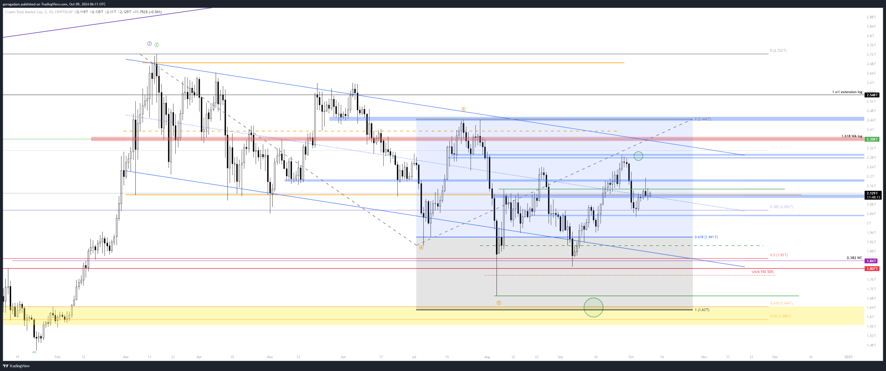 Ezúttal több helyen is NEM logaritmikus chartokat tettem be a HTF elemzésekhez, kicsit friss szemmel újranézve őket – ez alapján különösen tetszik az 1.63T szint, mint a III. hullám golden pocketja, az augusztusi alj kiütése, és egyben a december – januári konszolidáció visszatesztje.