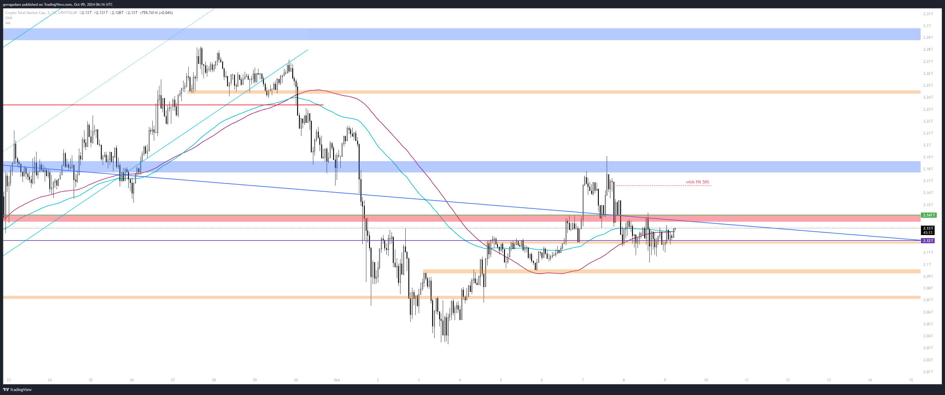 Ez arra utal, hogy a medvéknél az irányítás, és egy dolog aggaszt, a nagy kanóc felfelé hétfőről, amit lehet 50%-ig vagy teljesen betölt még a piac, mielőtt lefordul – a 2.12T-s szint elvesztése lenne short trigger így.
