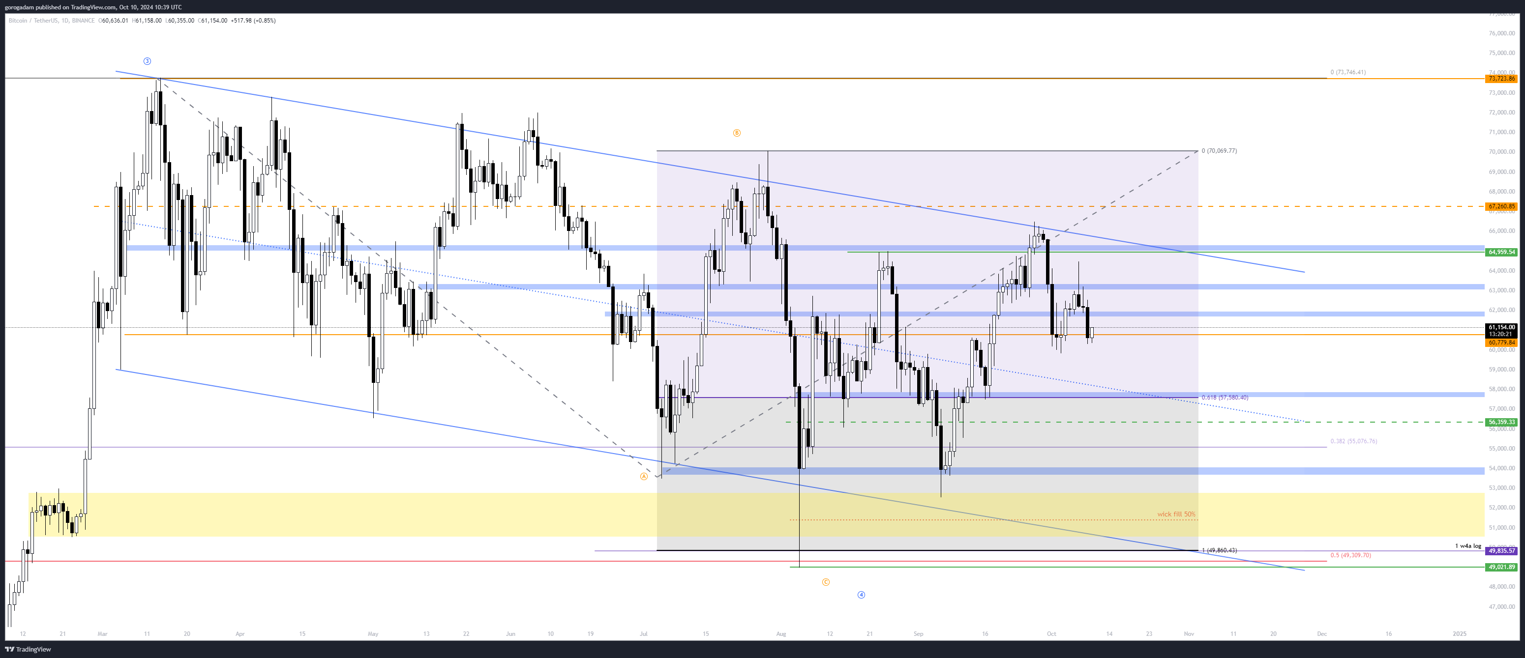 BTC elemzés – LTF helyzet: 60 800 a makró zóna alja, az elvesztése nagyon medvés lenne, de addig könnynel ehet, hogy akár többször is pattan még – az elvesztés egy gyors esést eredményezne.