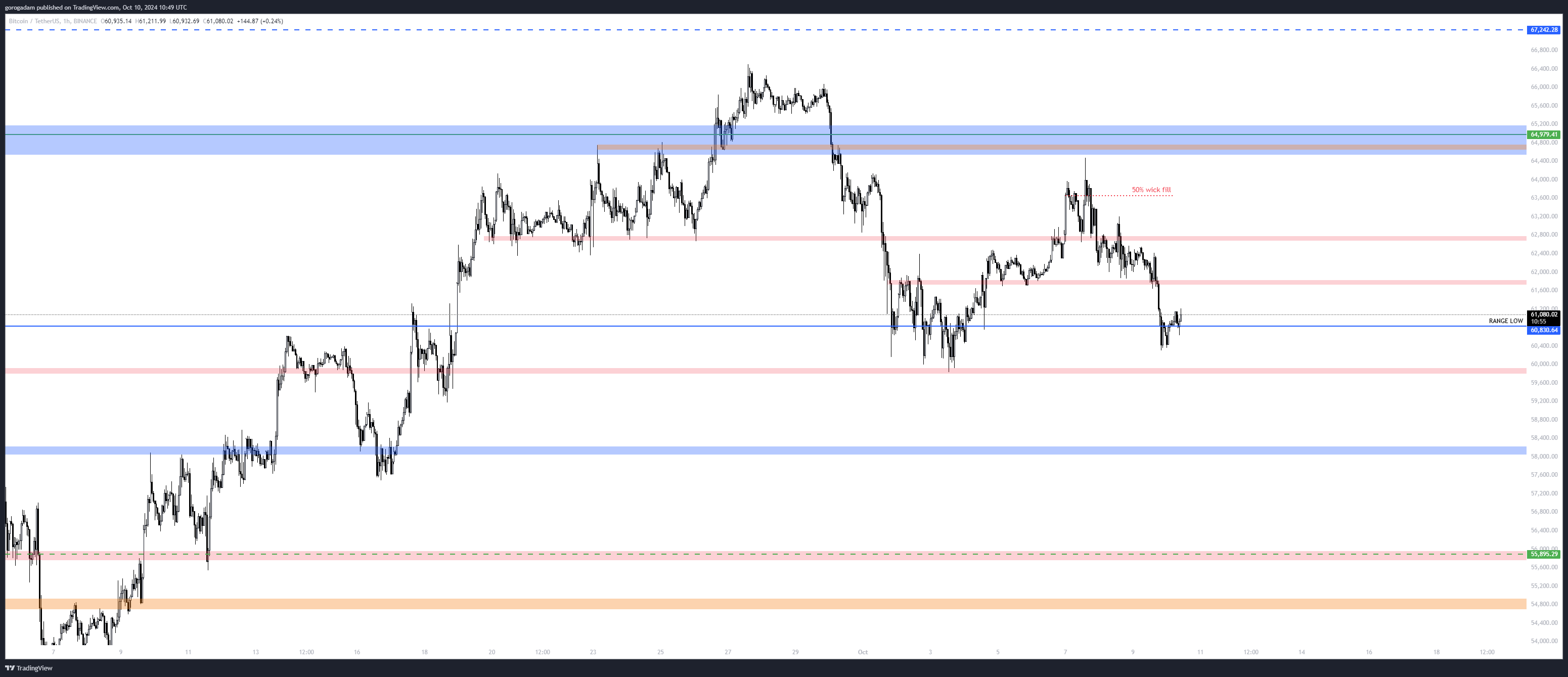 60 800: narancs makró zóna alja, az elvesztése/ellenállássá fordulás erősen medvés lenne, de amíg nem történik meg, addig pattanást adhat (failed breakdown volt már október elején).