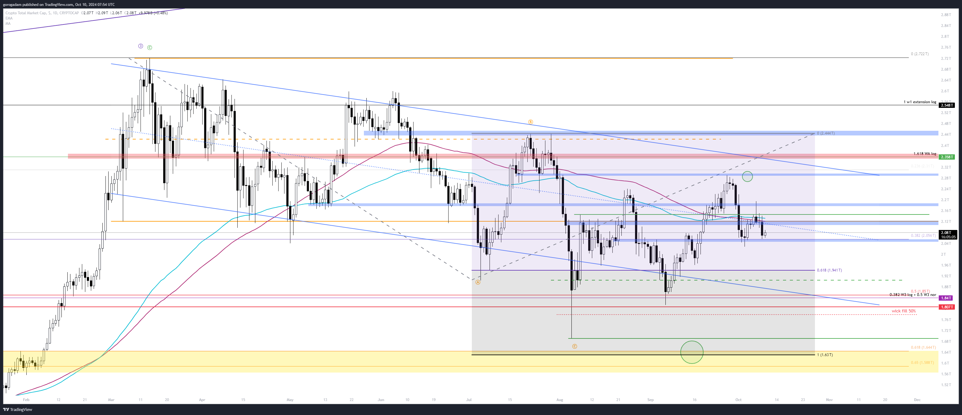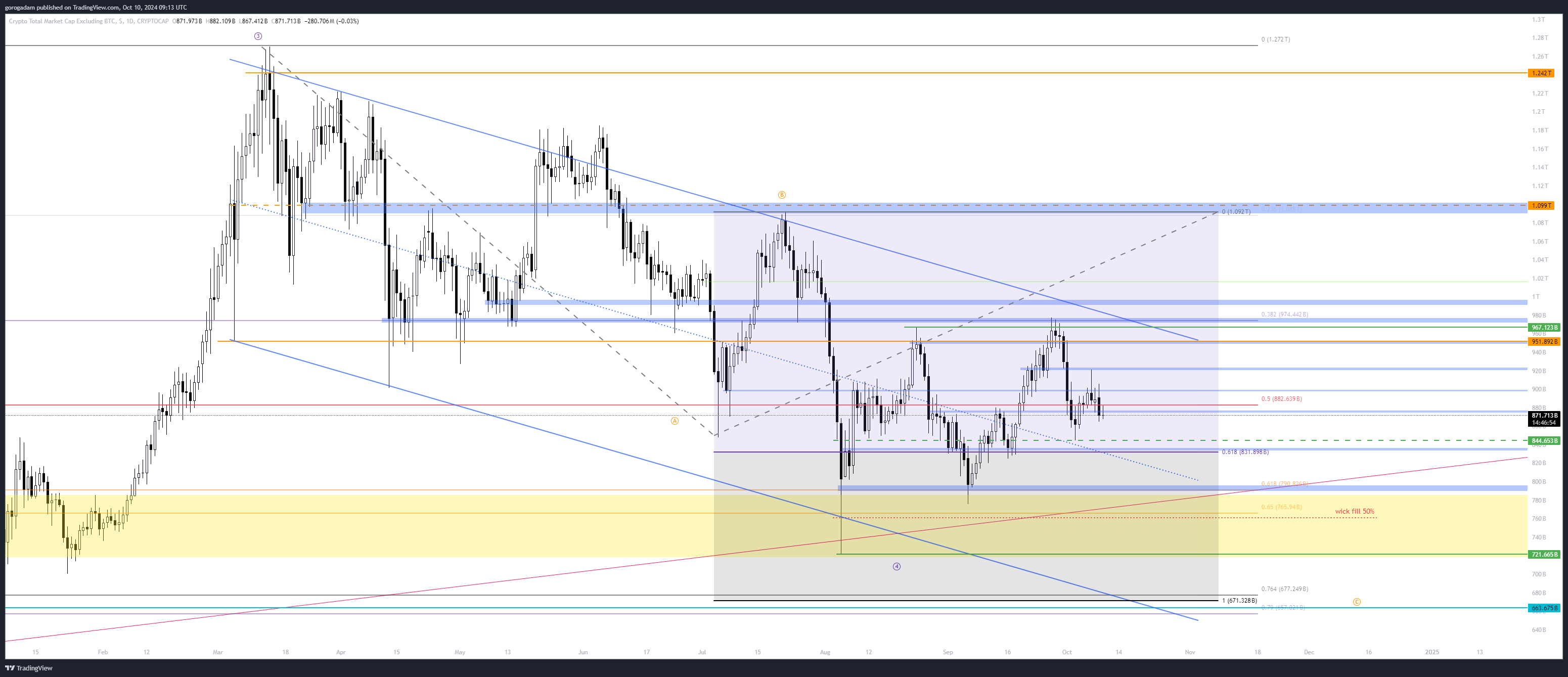 TOTAL2 elemzés – HTF helyzet: most látszik nagyon tisztán, hogy a szeptember végi emelkedés vége a 0.382-es FIB szint és napos szint medvés visszatesztje volt (974B-nél).
