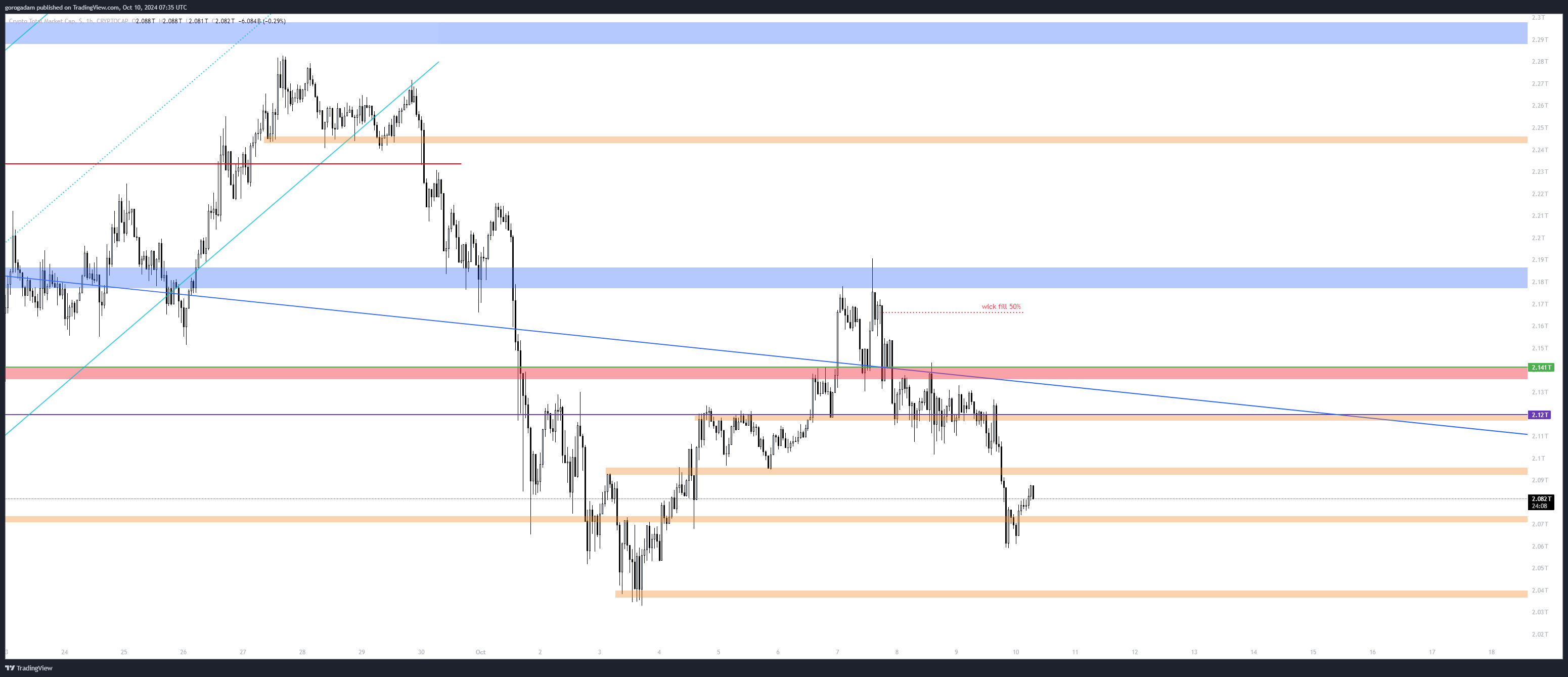 Ha ez egy Wyckoff akkumuláció, akkor a 2.056-os szint elvesztése esetén célozhatjuk a zöld zóna alsó felét először (1.85T), ahol vagy megáll, vagy pedig deviálja a zóna alját (1.64T).