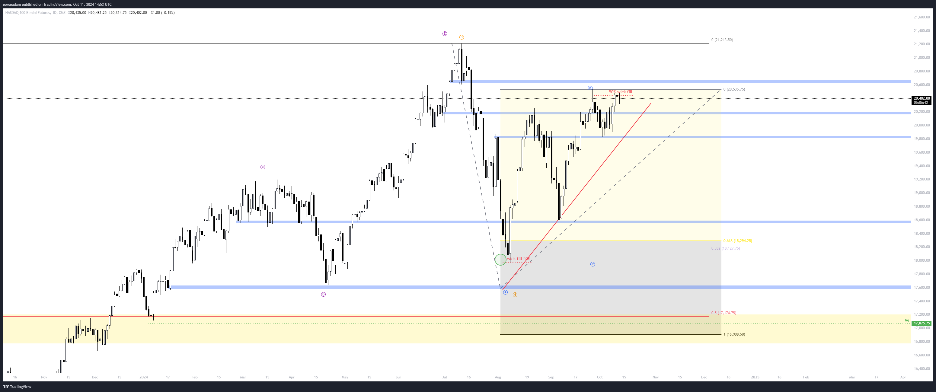 NASDAQ elemzés – HTF helyzet: a NASDAQ épp betöltötte a napos kanócot, amit hagyott maga után, ha itt lefordul, akkor jó eséllyel kezdődik a IV. hullám C hulláma, aminek a célára 16 900 lenne.