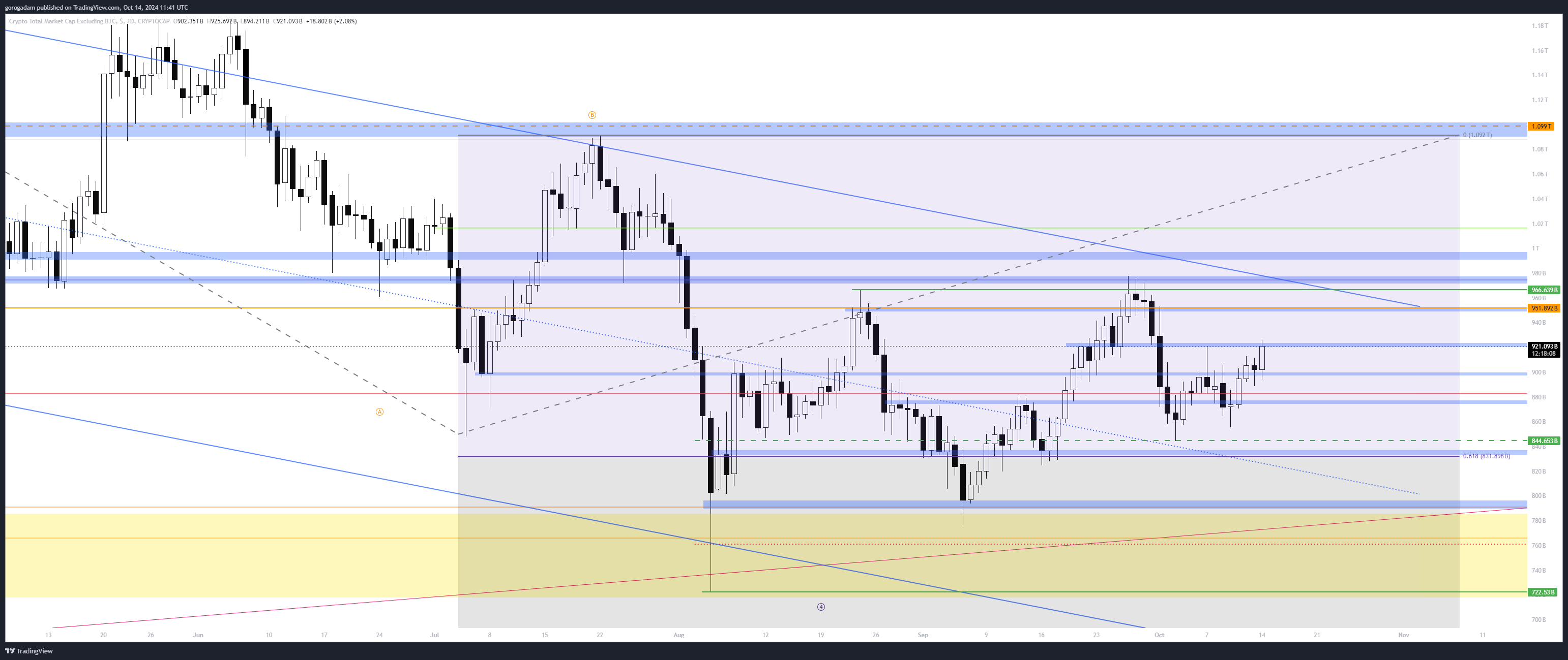 TOTAL2 elemzés – HTF helyzet: korábban már írtam, hogy a TOTAL2 adja a legpontosabb jeleket, és a leggyengébb index jelenleg. Ha lefordul a 920B-s napos szintről, akkor az rossz előjel lenne, mivel ez egy többször védett napos támasz alulról tesztje lenne (textbook downtrend lefolyás tehát).