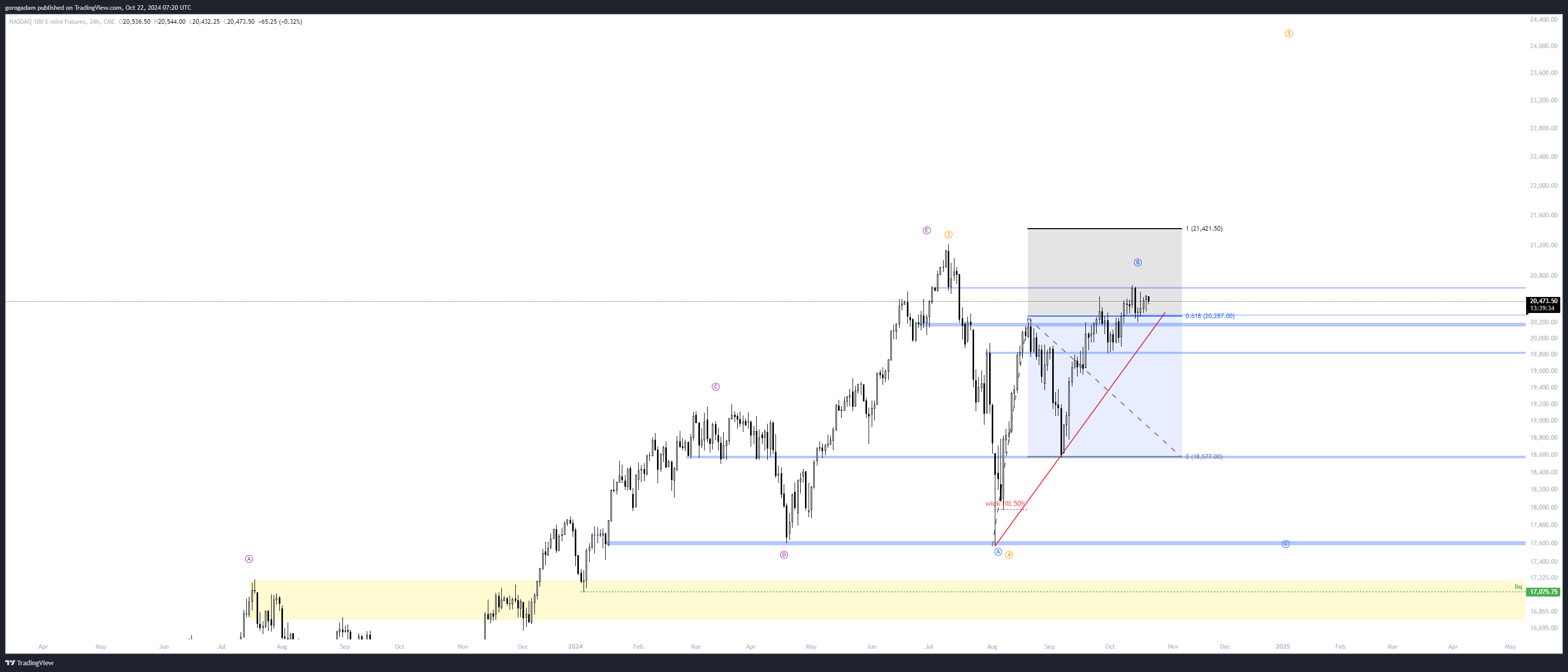 NASDAQ elemzés – HTF helyzet: jelentősen gyengébbnek tűnik az ES-nél, a fő szint, amit nézek az 1-es extenziója a mostani 3 alhullámból álló alakzat első hullámának (21 400-nál) – ezzel kiütésre kerülne az előző csúcs.