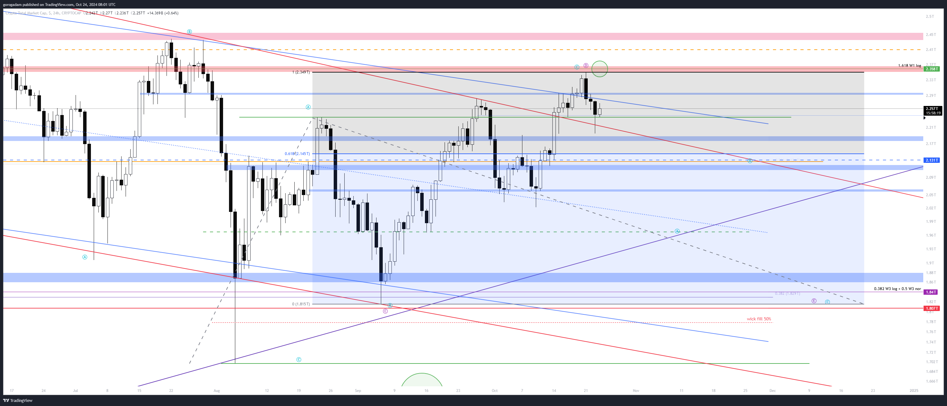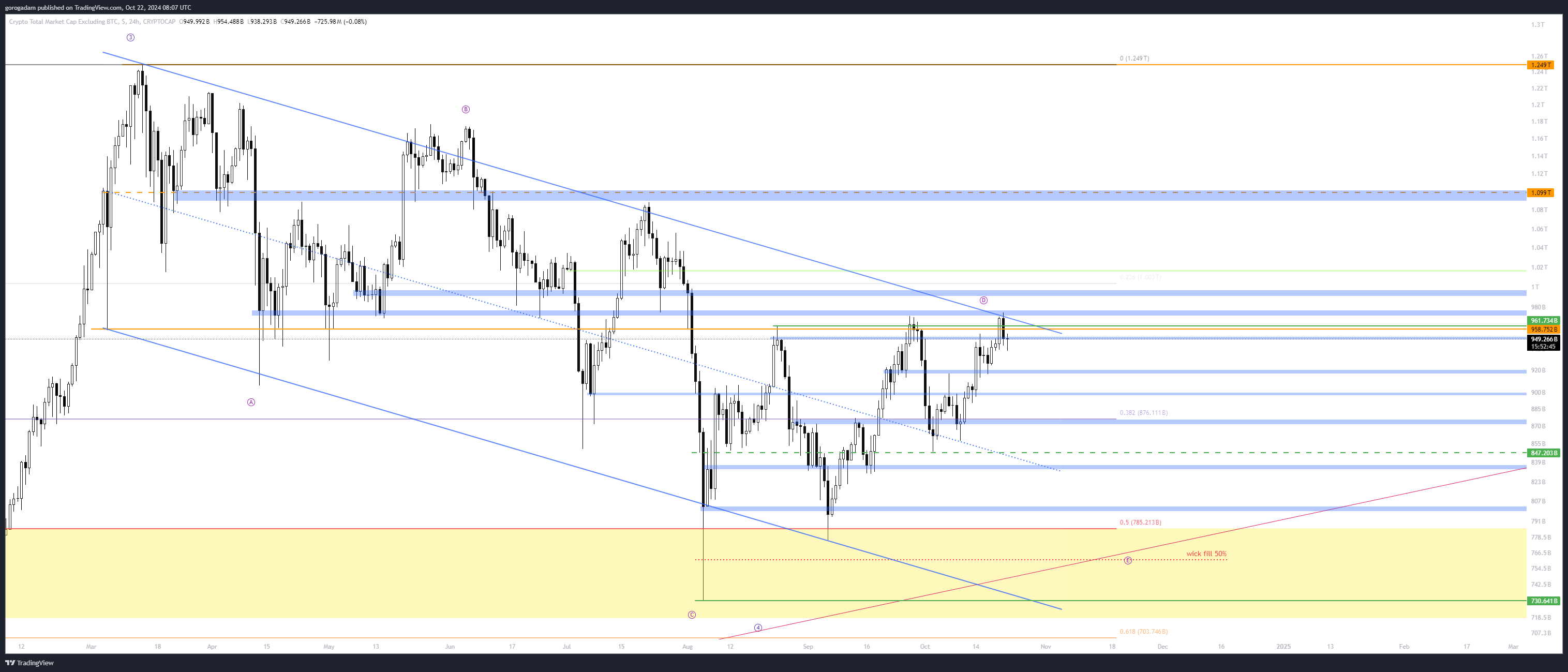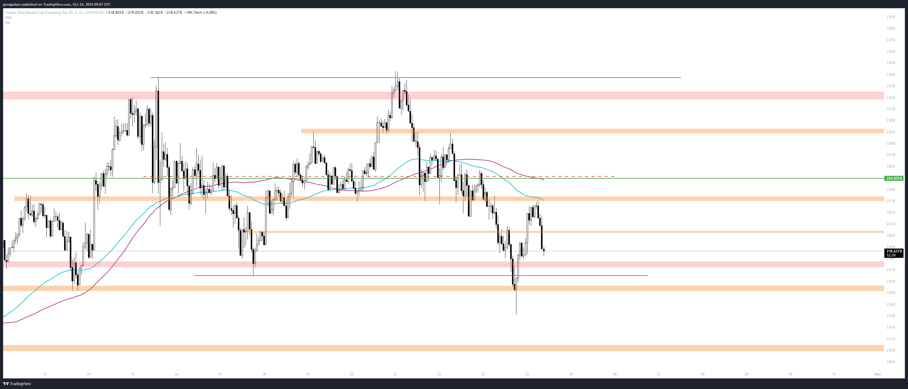 Elliot Wave szempontjából egyelőre nem magyarázható ami történik (csak BTC-n és TOTAL-on), de úgyis főleg a price actionre koncentrálok, az pedig a 218B-220B napos szint alatt gyenge, és gyorsan 200B-ig eshet onnan.