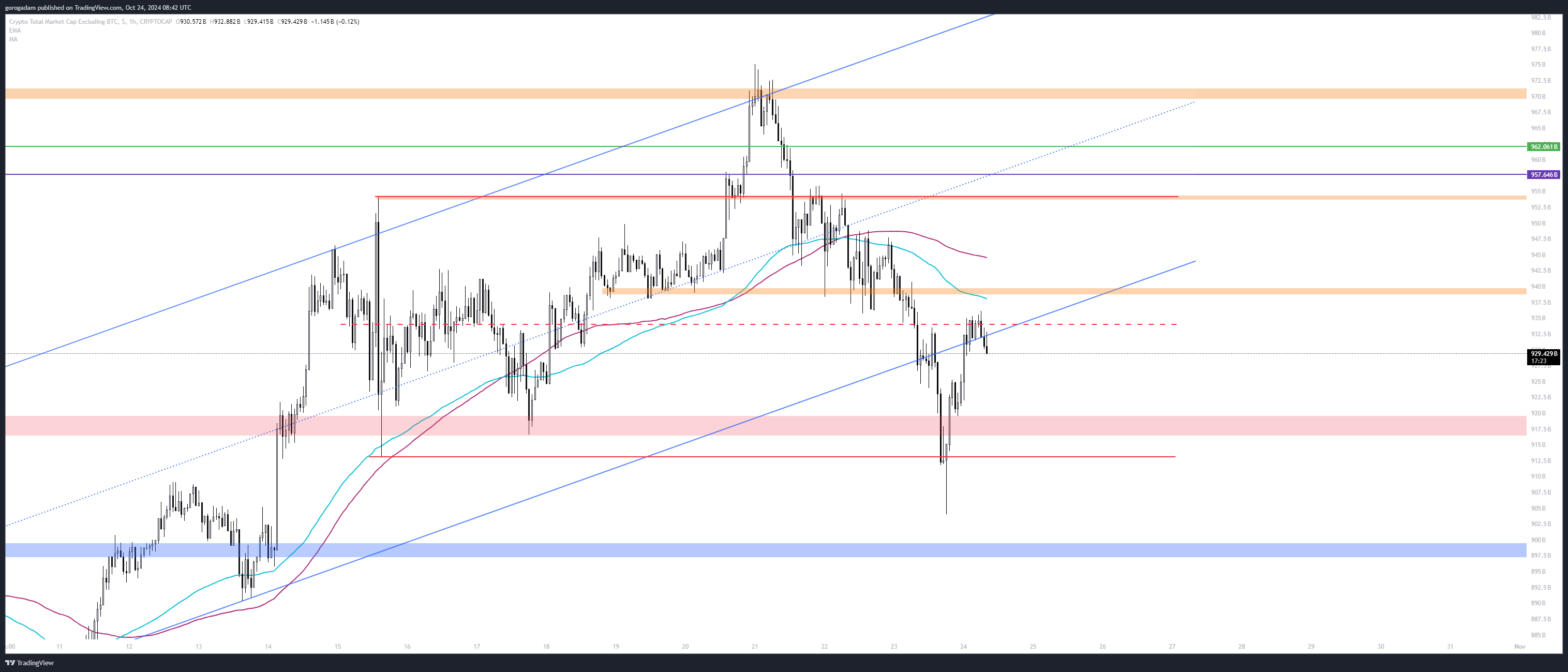 920B: többször védett napos szint, ami október elején nagy erővel leszakadt, most ismét visszaszerezte és támasszá fordította az árfolyam – szvsz ennek az elvesztése lenne napos szinten kontrollvesztés a bikáknak.