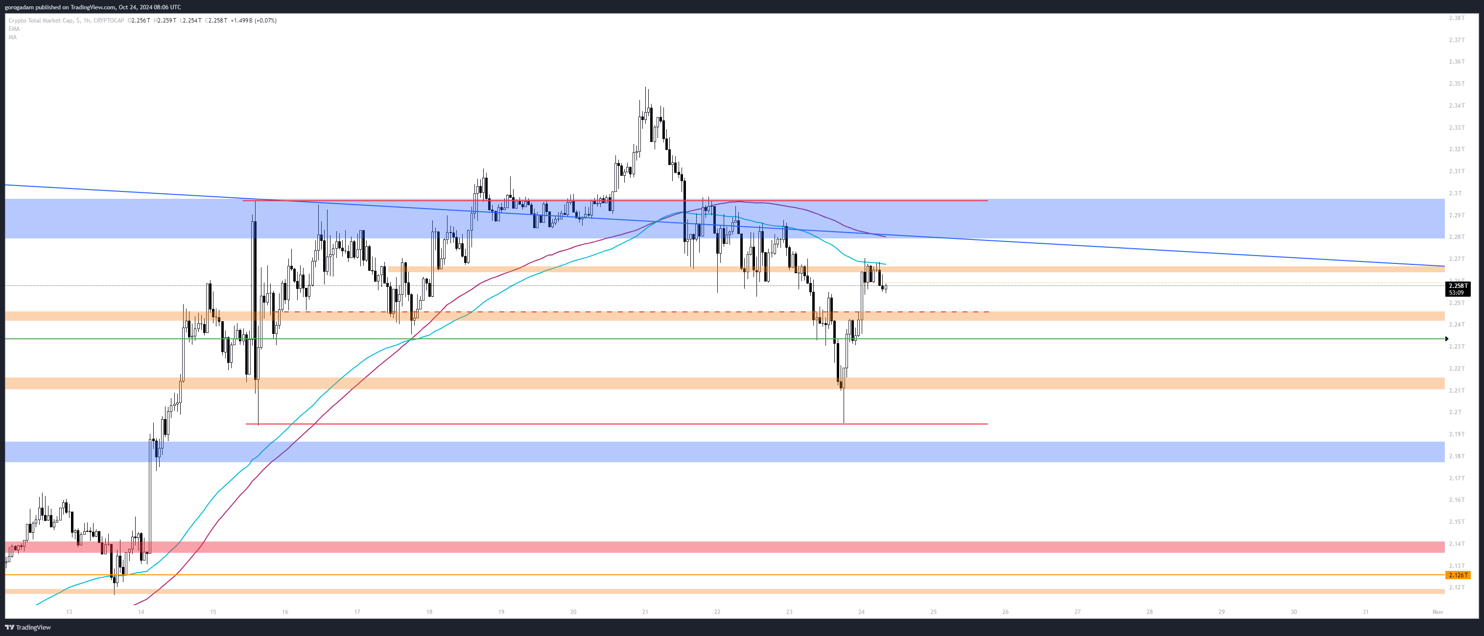 TOTAL2 elemzés – HTF helyzet: a TOTAL2 folyamatosan gyenge a hét eleje óta, amikor tesztelte a kék csatorna tetejét, így szerintem az ETH jó short lehetőség, ha felszúrna a piac.