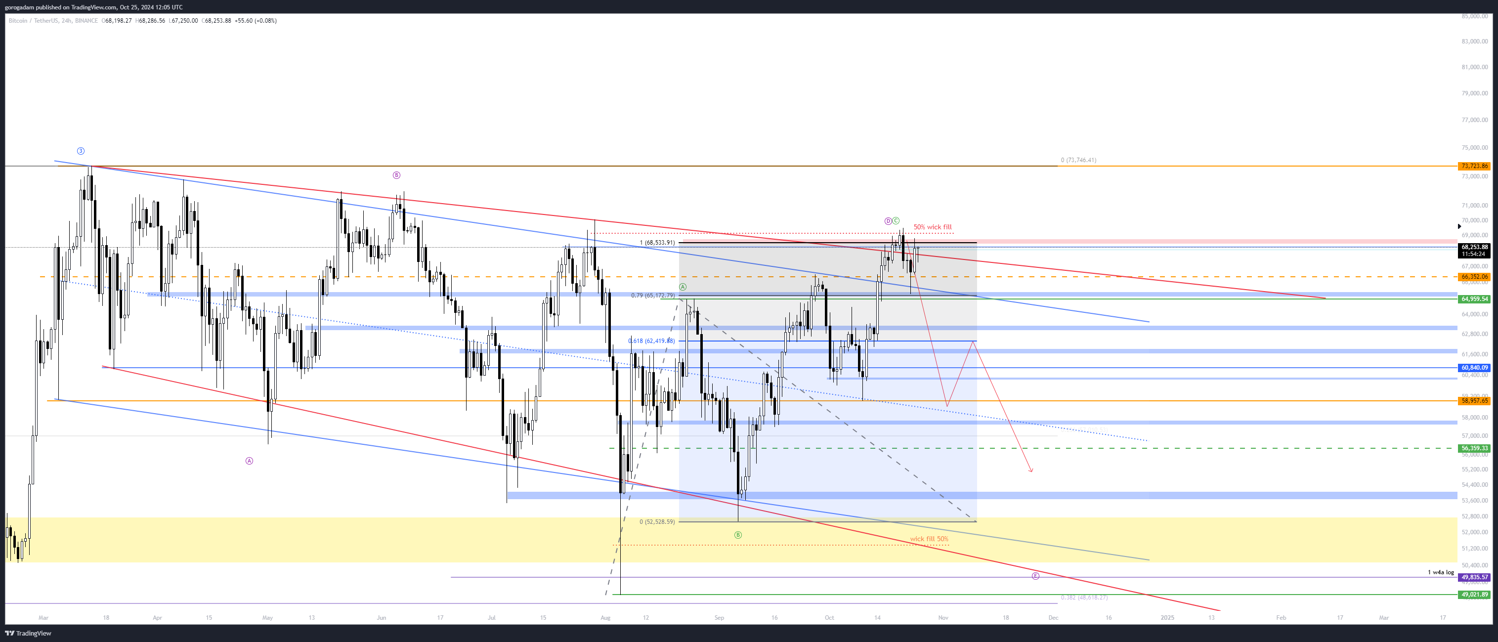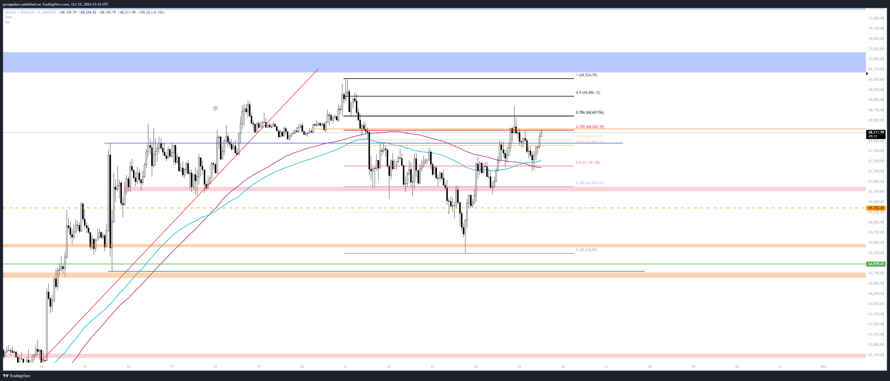 BTC elemzés – LTF helyzet: úgy tűnik, hogy a piac már nagyon menne le, de a BTC még fenntartja. Következésképpen a BTC gyengesége adná meg a jelet az esésre, ha az jön, ez leginkább a 66 800 elvesztéséből látszik majd.